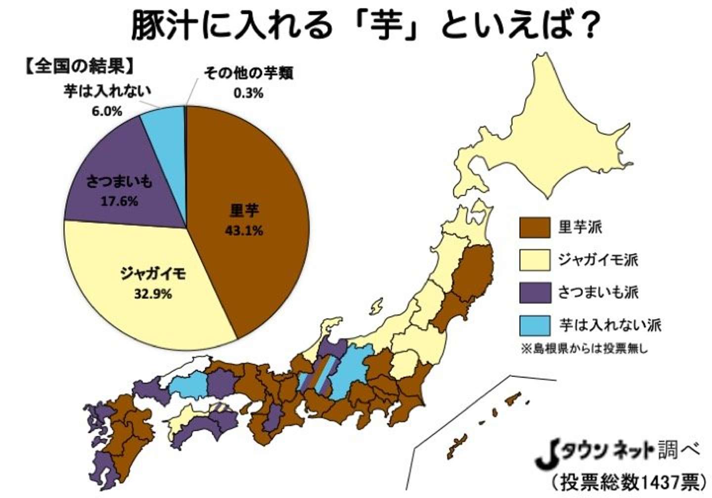 「豚汁に入れる芋といえば?」←この質問への回答で、相手の出身地方が分かるらしい