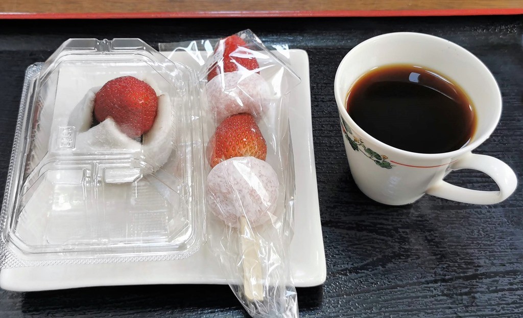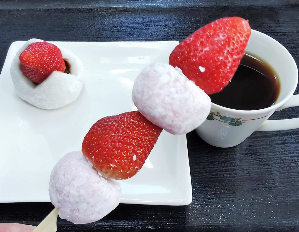 この日に別のところで売られていた「いちご大福」280円と「いちご大福串」401円。