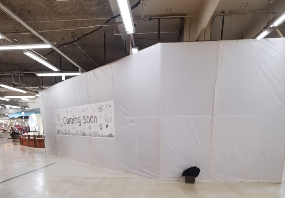 ちょうど工事をしていて、白い幕に「Coming Soon」と。