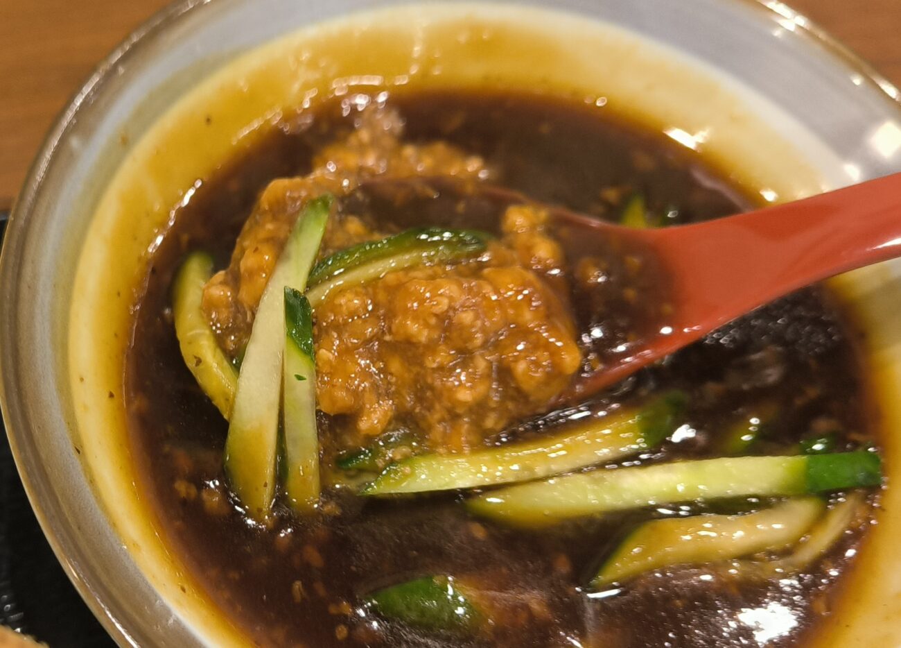 このジャージャー麺の汁、ややしょっぱめで出汁がマジ美味い。