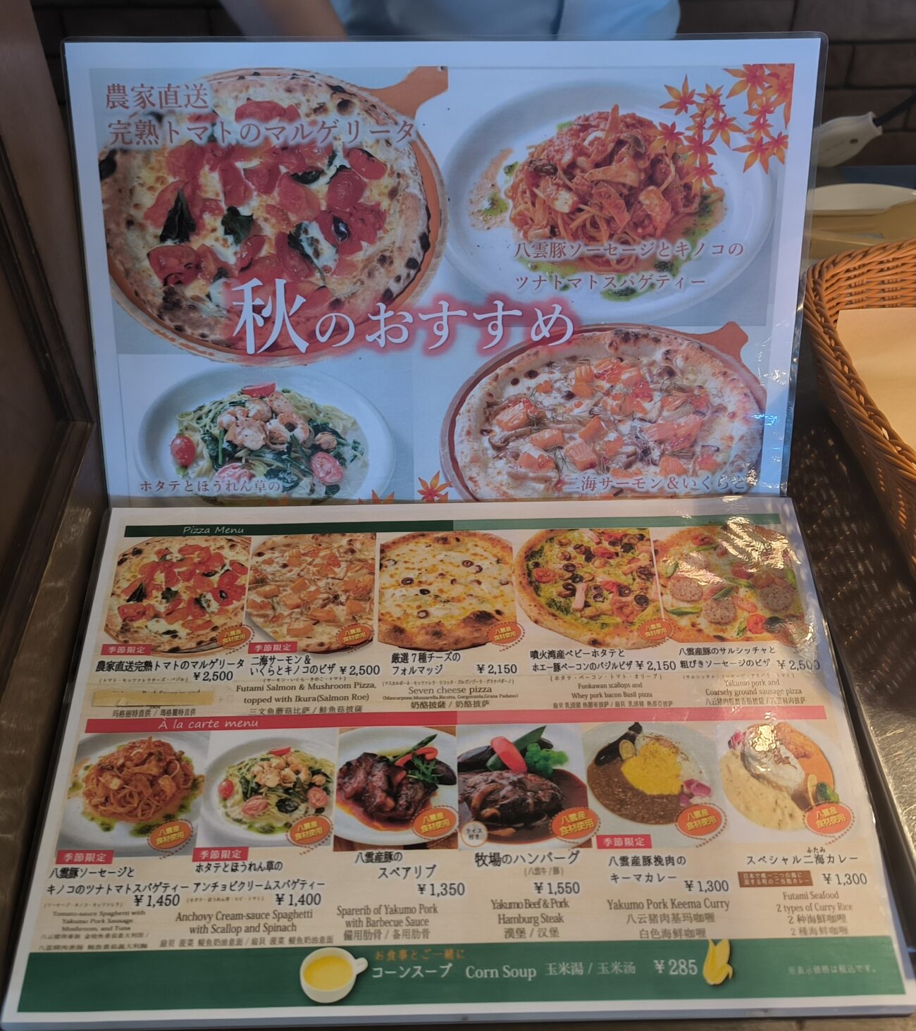 到着してメニューを眺めると、ピザは2000円を超えるものばかり。中には2500円台もあってなかなか強気かな。
