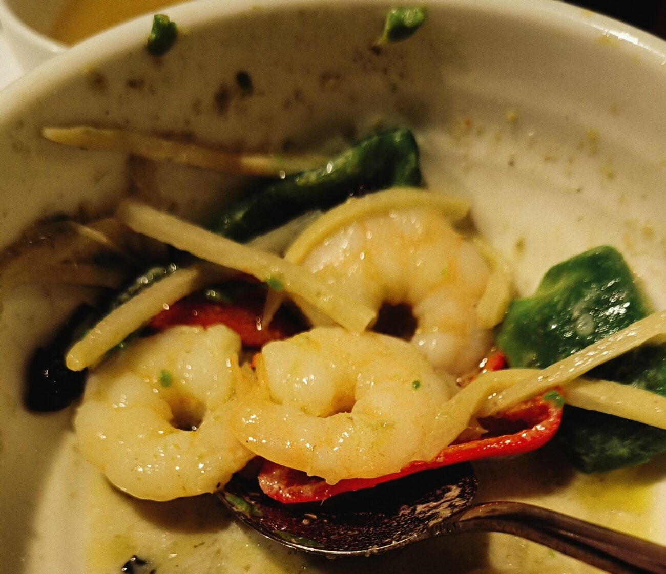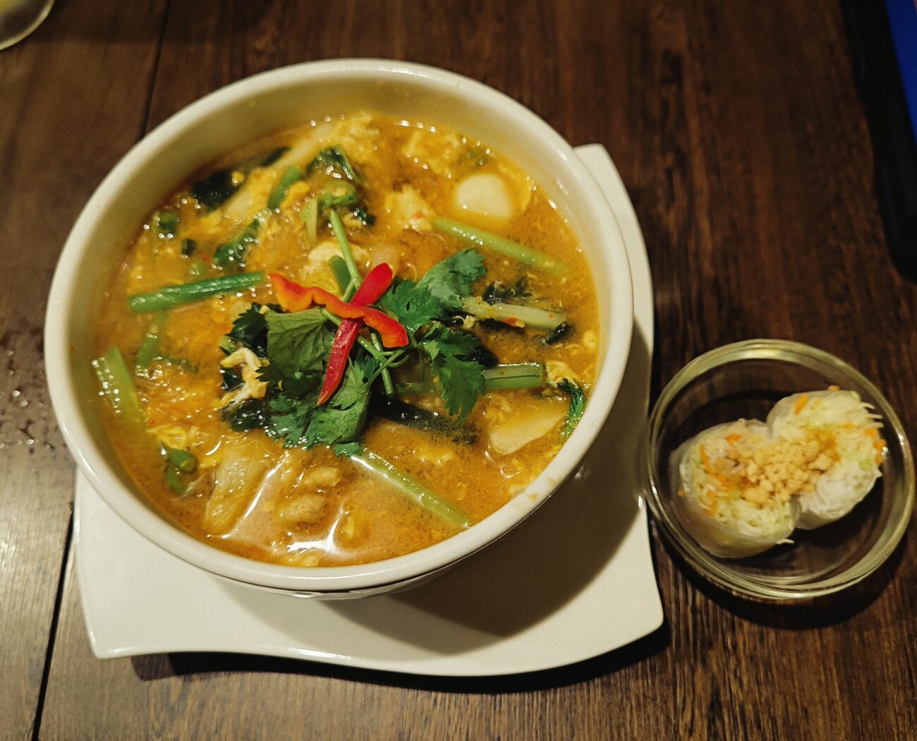 「もう少し辛さがあってもいいかな?」と思ったら、横に添えられたトムヤムクン風のスープが遠慮抜きに辛いんです。