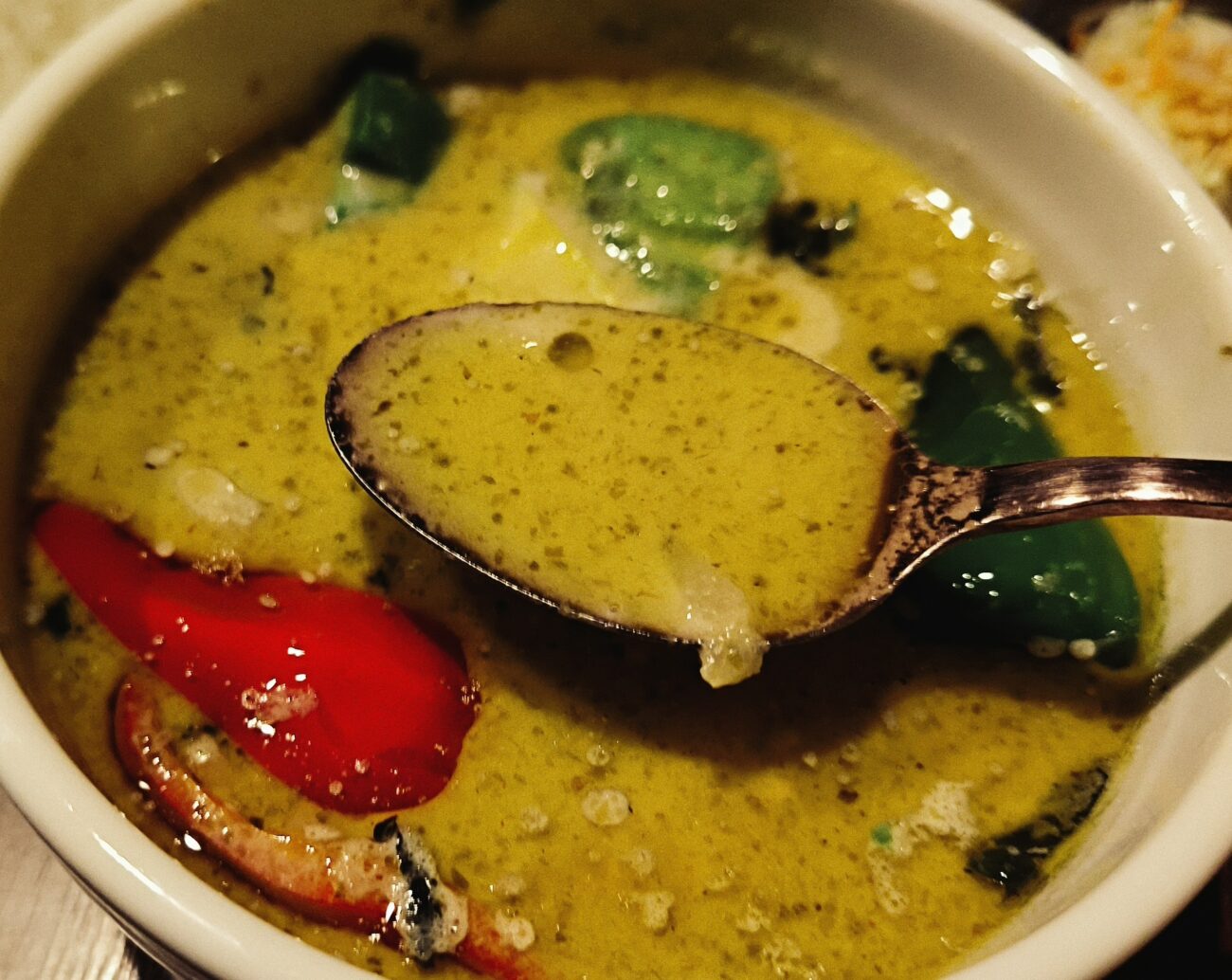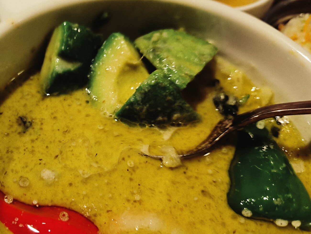 ココナッツミルクのまろやかさ、グリーンカレー特有のハーブの爽やかさ、そしてアボカドの味がが加わって、予想以上の“当たり”!