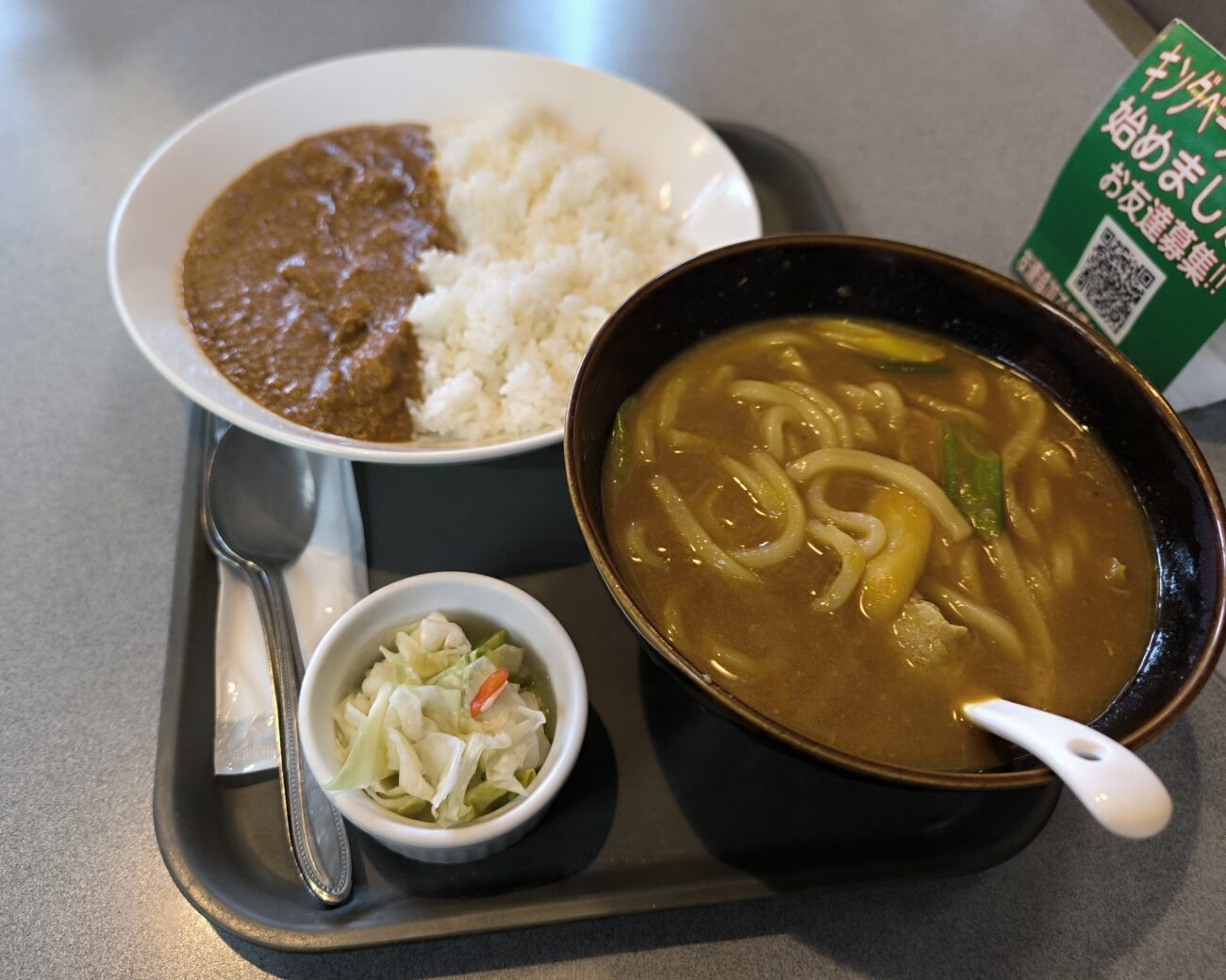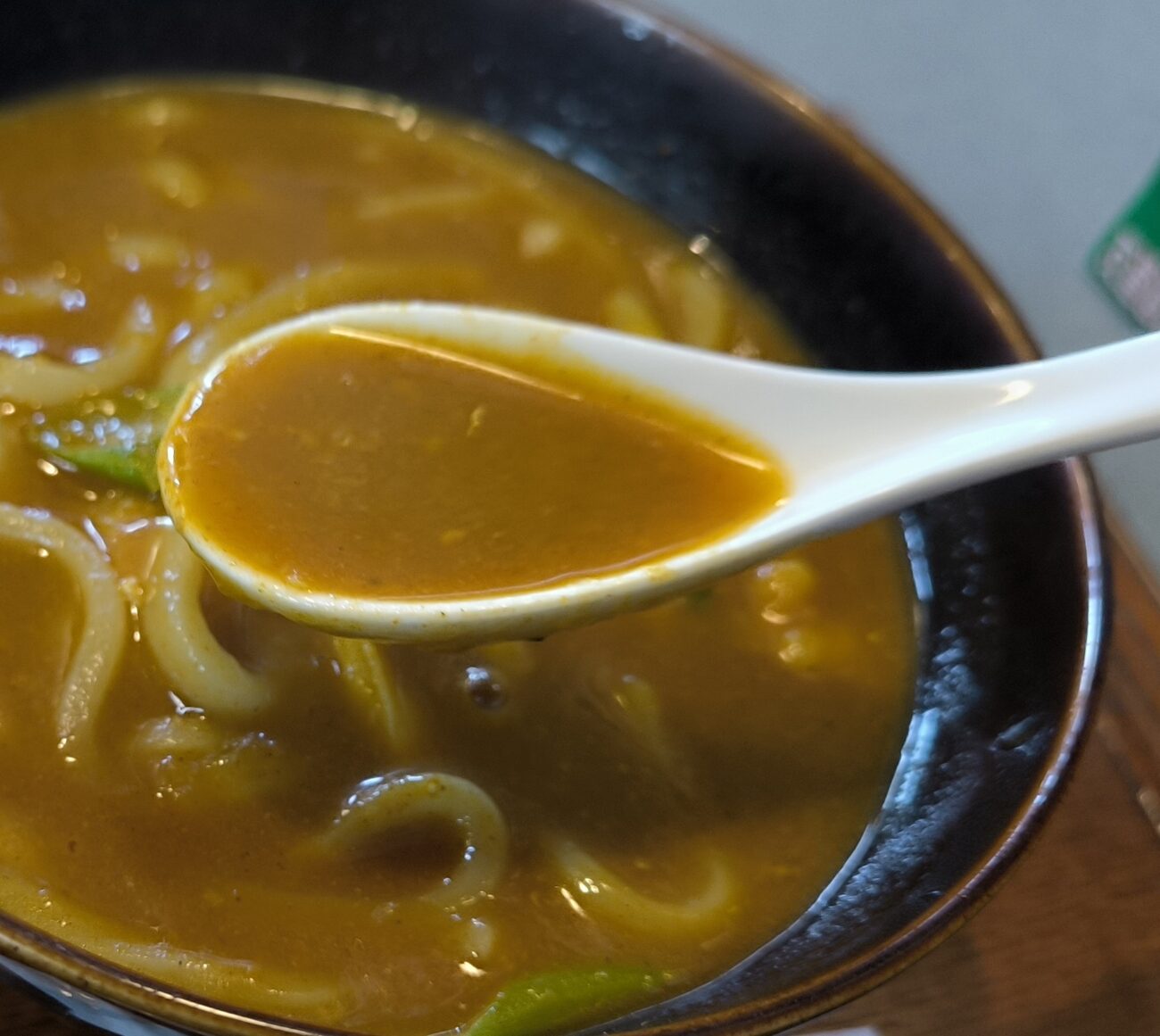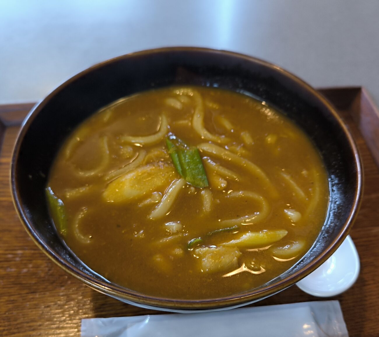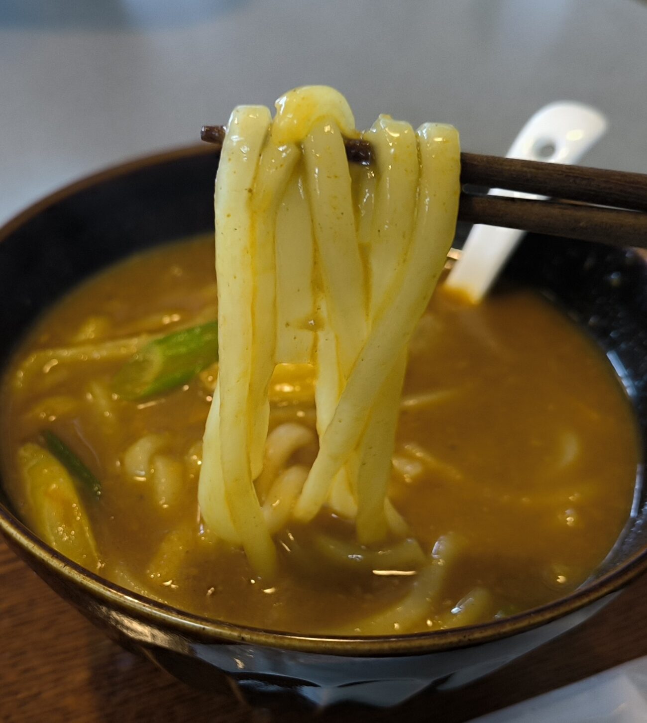 カレーうどんは、とろみのあるスープが麺にしっかり絡み、思わずご飯が欲しくなる味。