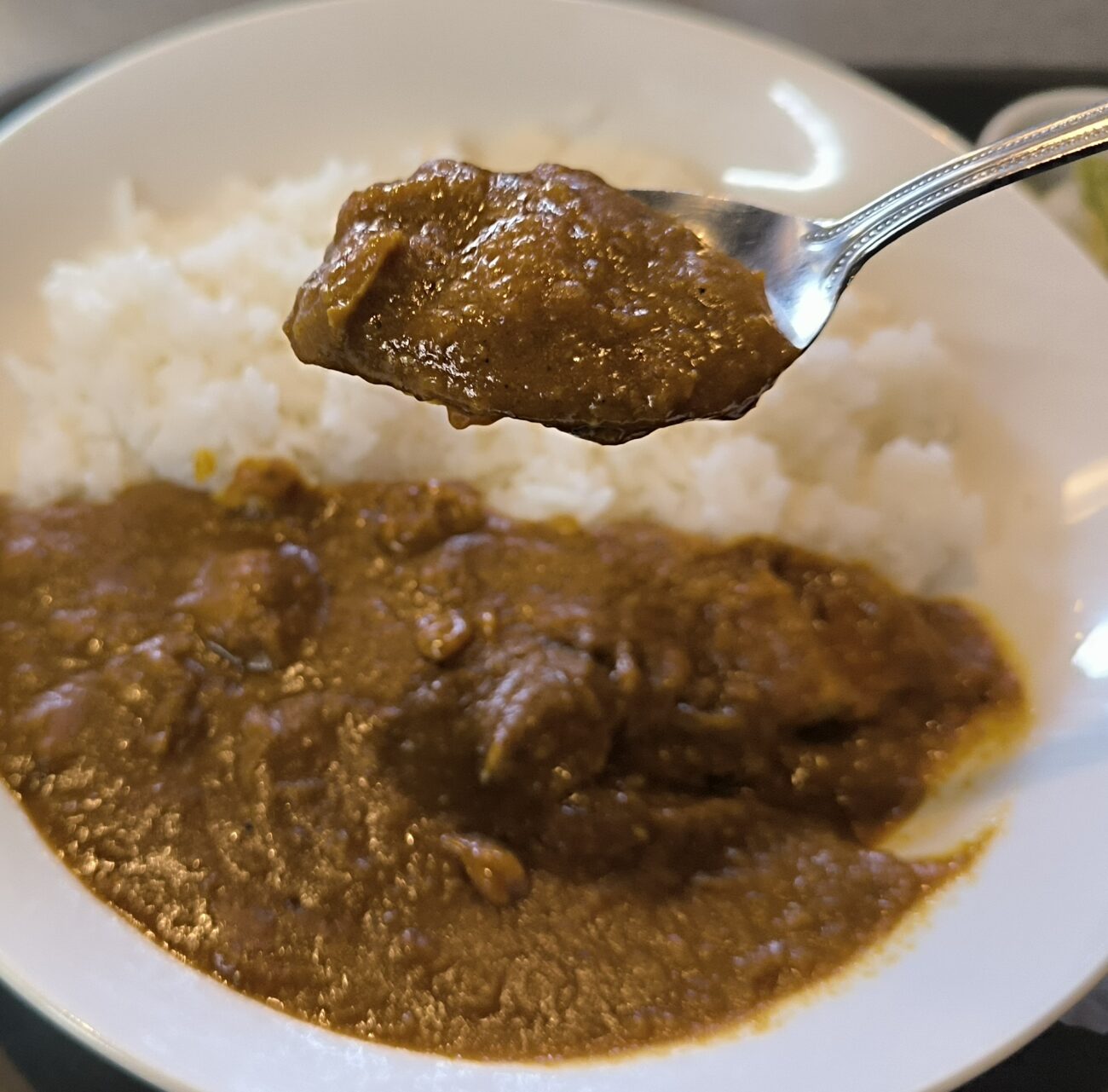 カレーだけをすくって食べてみると、キングカレーとはまた違った味わいで、こちらはやや甘口寄り。