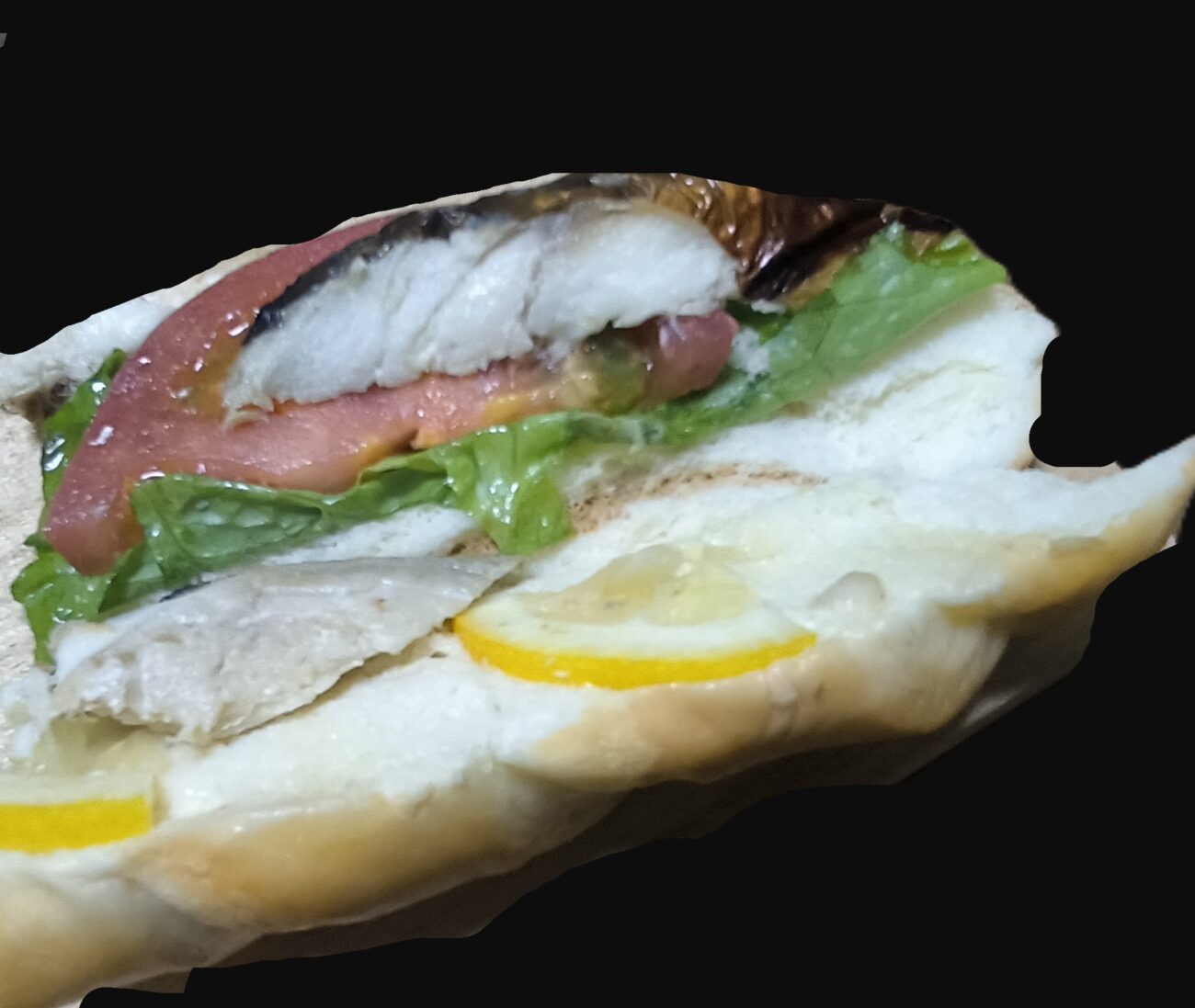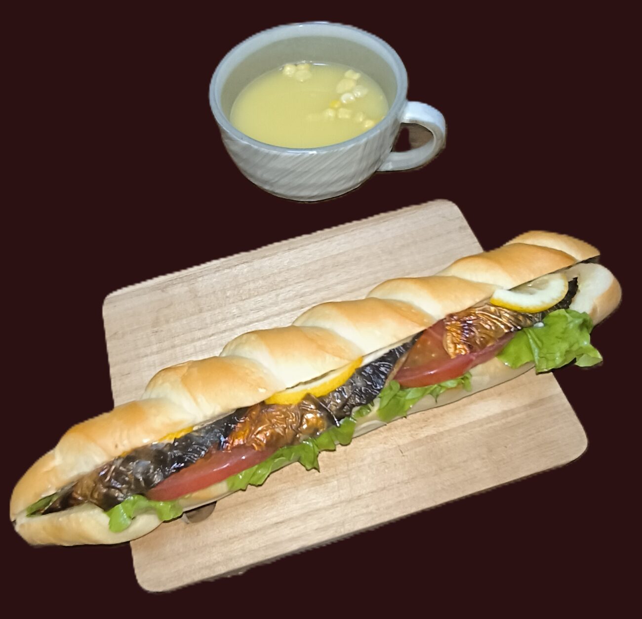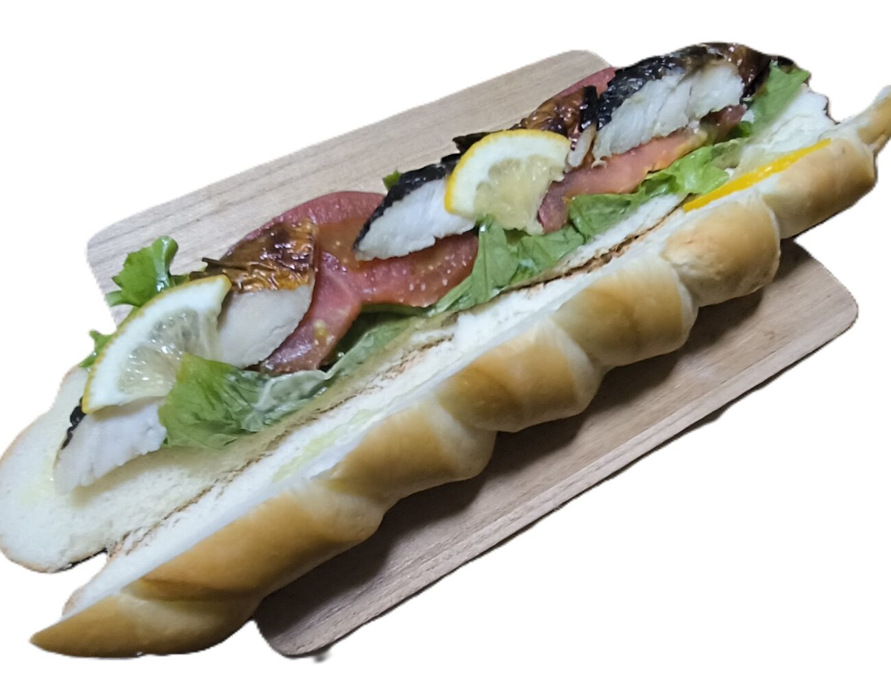 パンの間には、香ばしく焼かれたサバがしっかりと挟まれています。