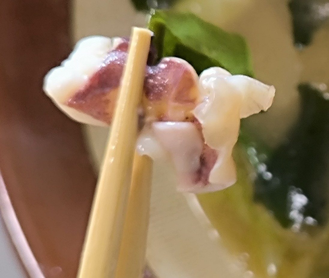 ベビーホタテ、たこ、イカ、ワカメ、うずらの卵、さやえんどう…具の顔ぶれをひとつひとつ確認して、「おお、これはいいなー」と向かいから見て思うのでした。