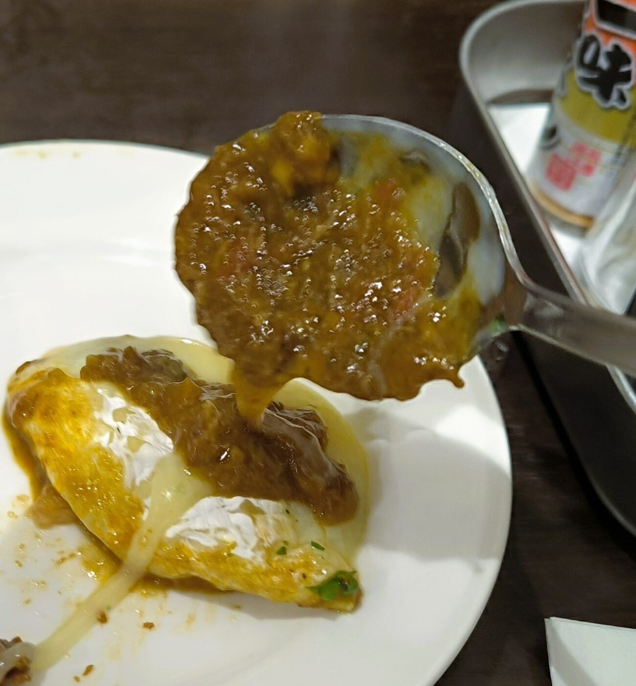中央にはチーズが存在感を示し、周りにはカレーが広がる。