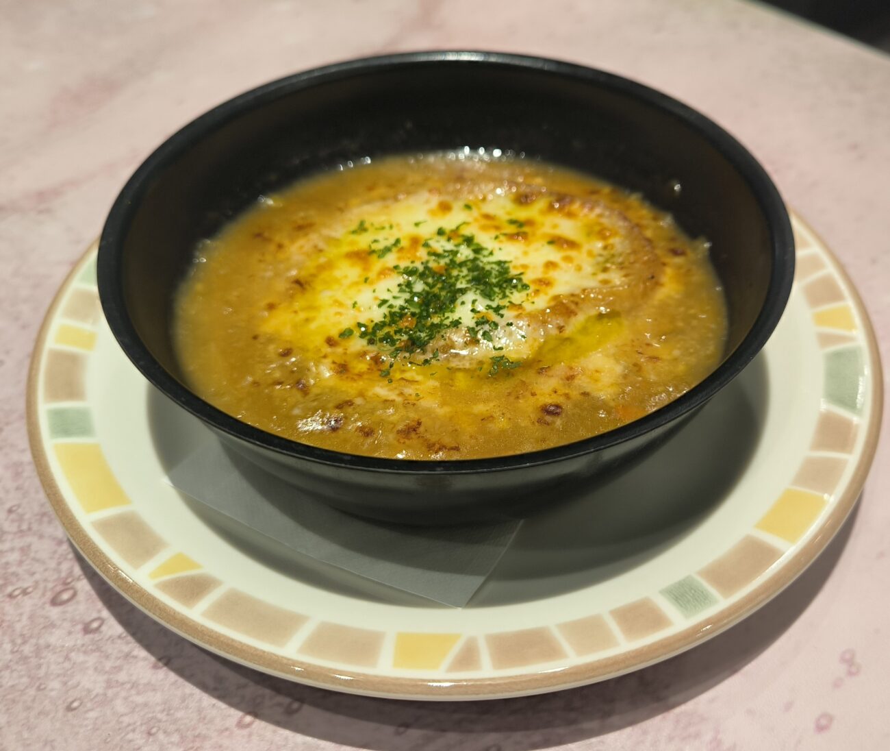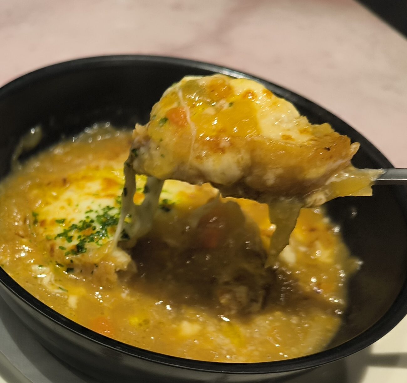 たっぷりのチーズが玉ねぎの甘みと合わさって、スープ全体がまろやか。
