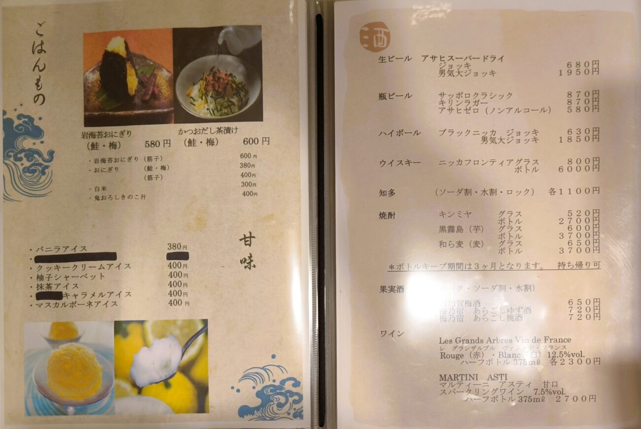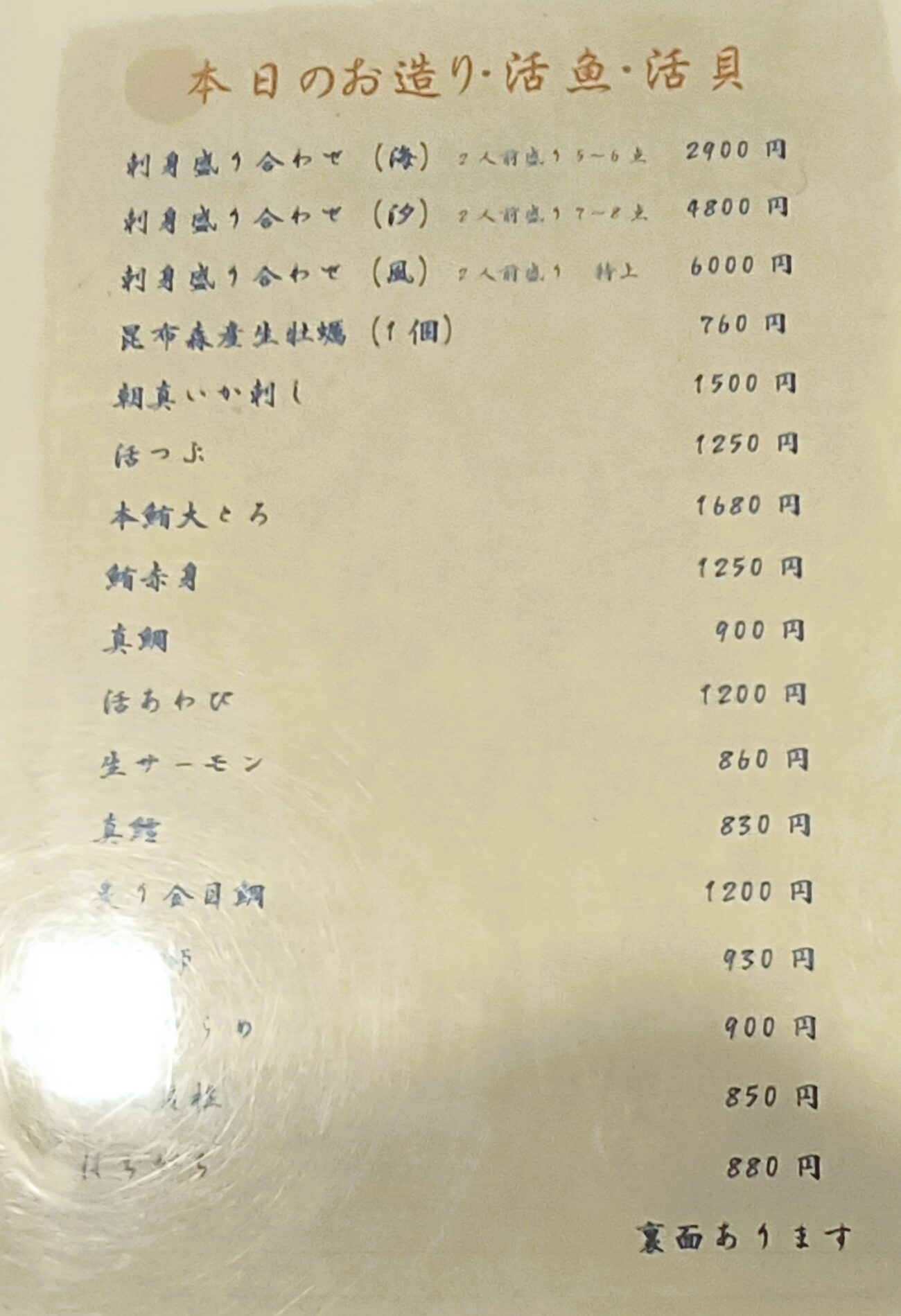 さて、肴をどうするかメニューとにらめっこ。刺身盛り合わせは、2人前で2900円~6000円とけっこういいお値段ですが、一番安い2900円の「刺身盛り合わせ(海)」を選びます。