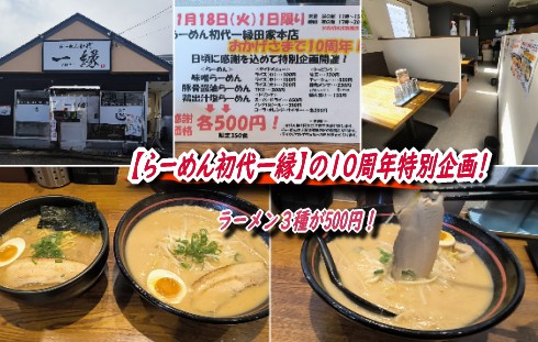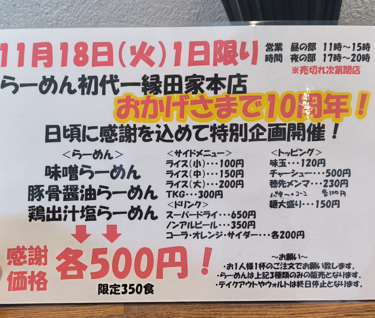 11月18日(火)、らーめん 初代 一縁 田家本店が「10周年ありがとう企画」として、味噌・鶏出汁塩・豚骨醤油の3種ラーメンを、なんと各500円で提供。