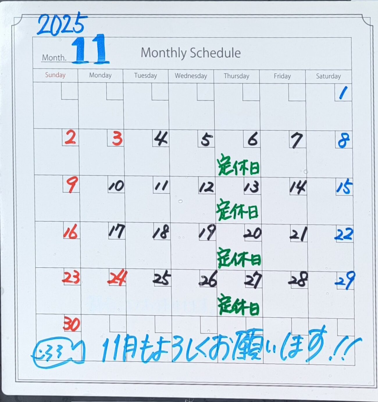 11月の定休日