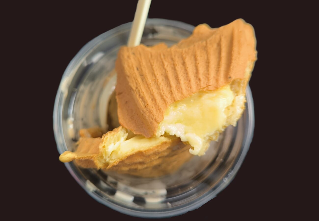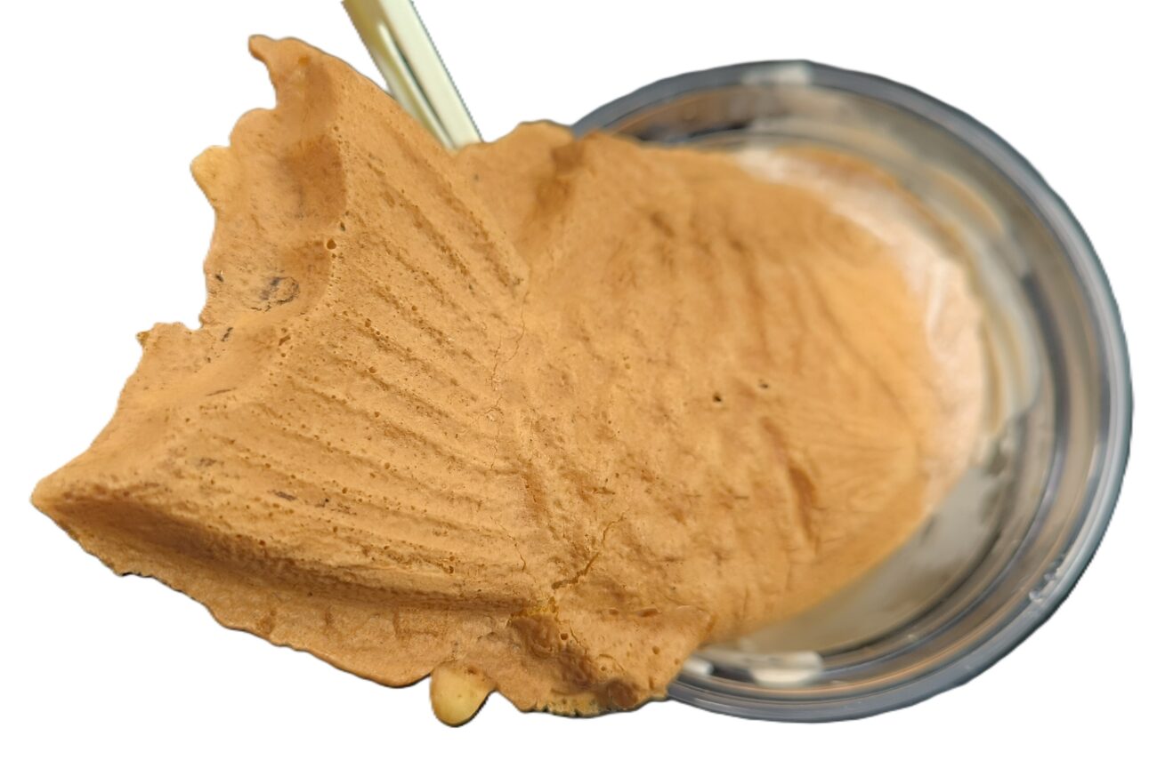 ソフトクリームの中にしっかりとたい焼きがはみ出しています。