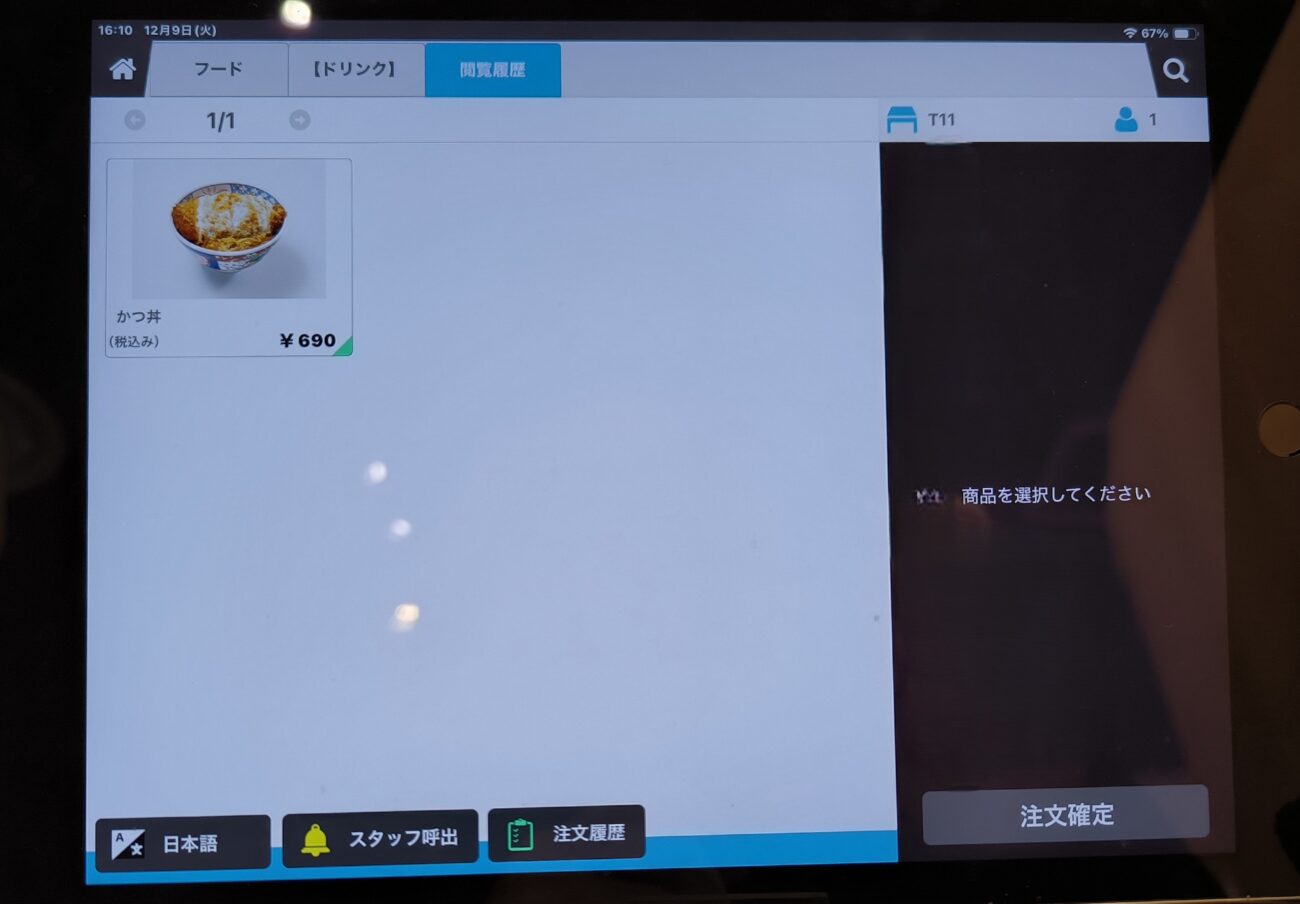 タブレット注文の際、履歴画面の右下に“確定”の文字があって、「あれ、注文できていない?」と一瞬焦りましたが大丈夫でした。