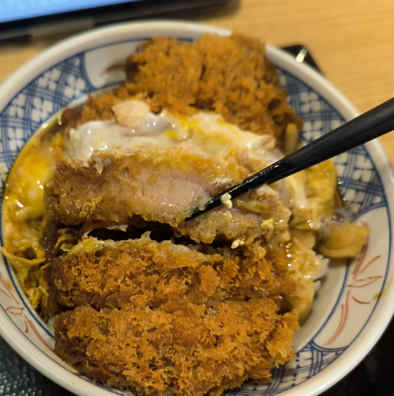 運ばれてきた「かつ丼」は、卵の半熟具合がとても良く、見た目からして美味しそうです。肉の厚さもしっかりあって、ボリューム感も十分。