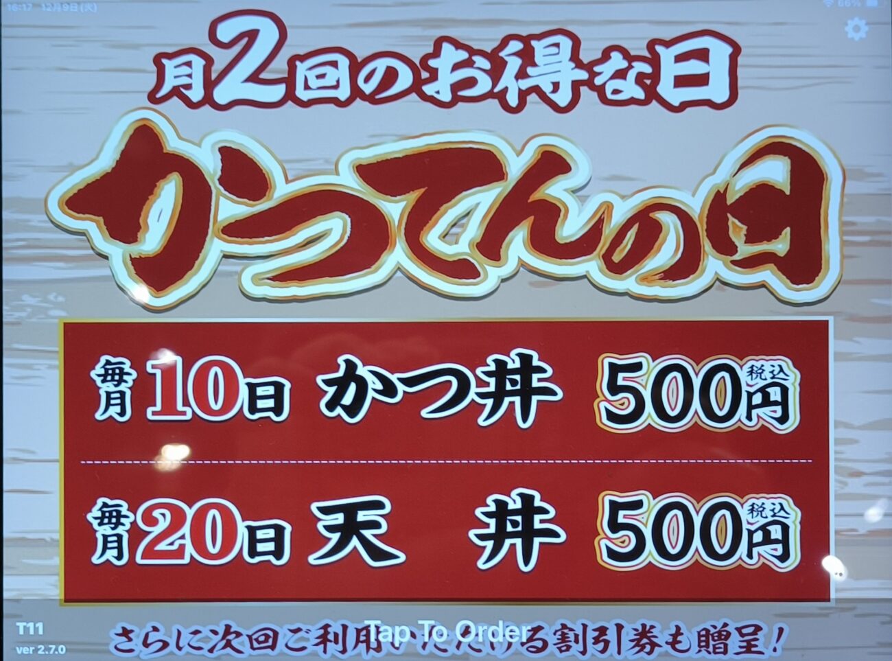 明日の10日は、かつ丼が500円で提供されます。そういえば20日も500円です。