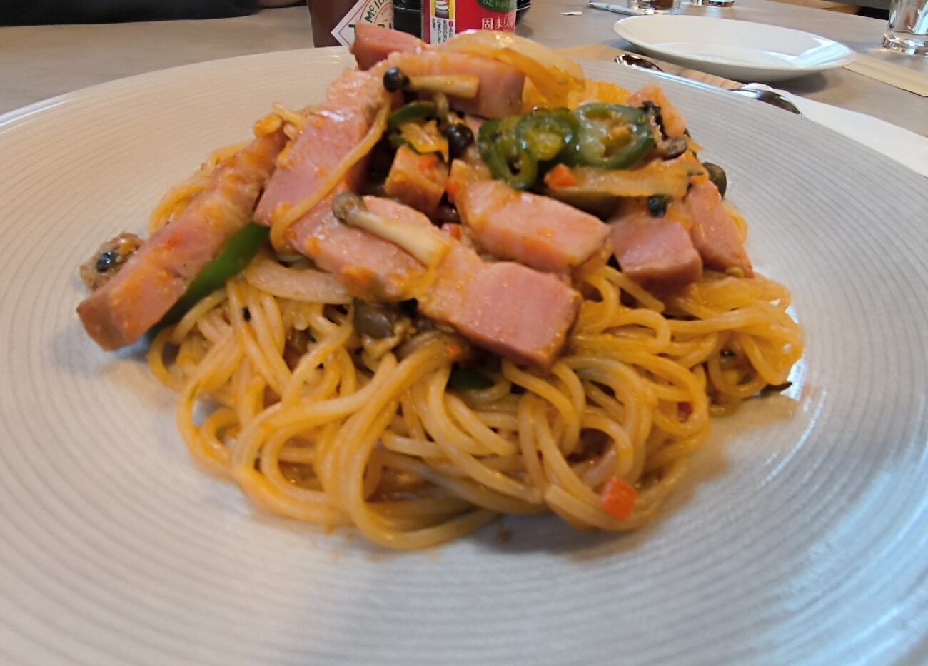 出てきたナポリタンを見てまずトッピングされたハムの量!
