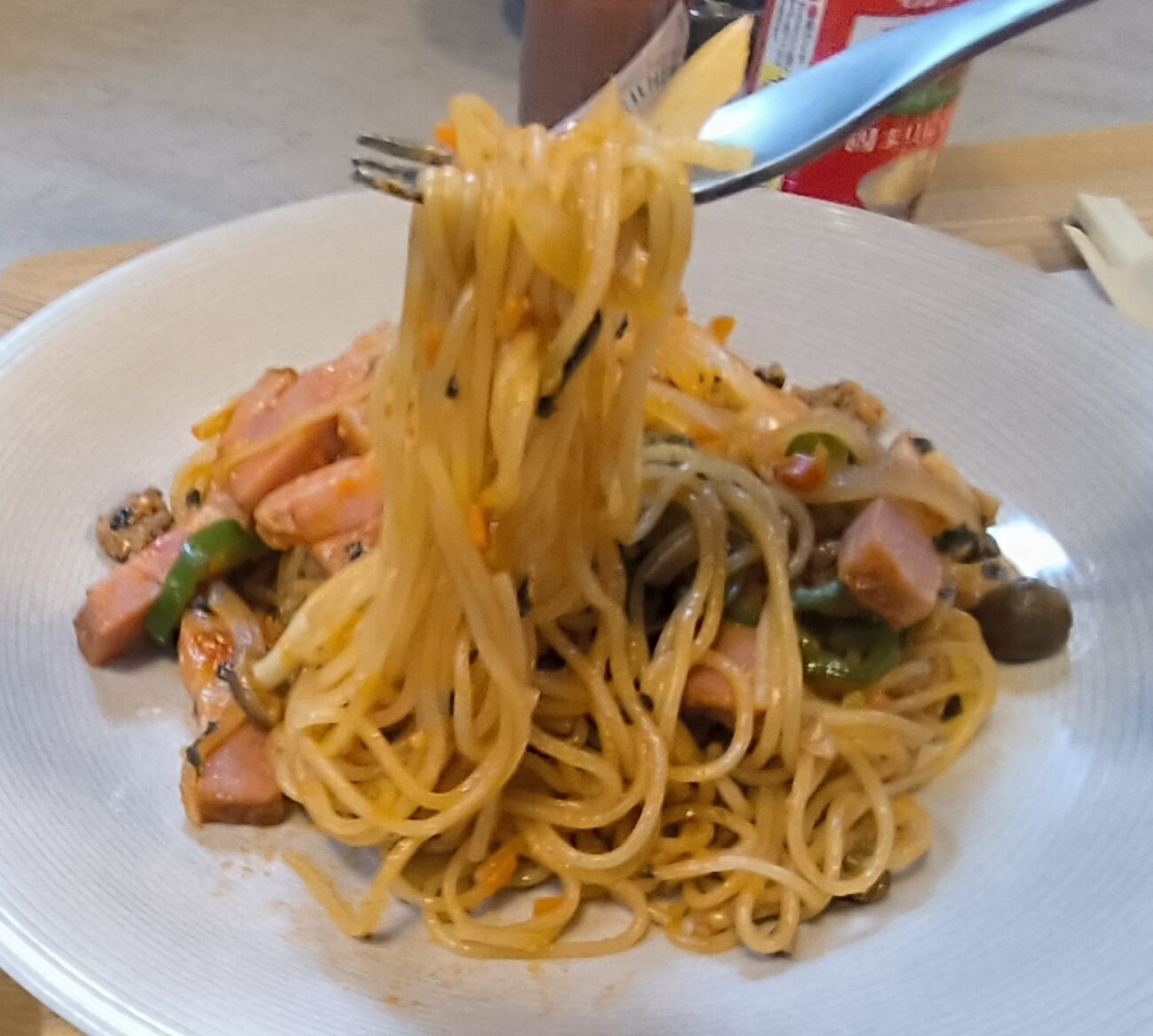麺は、ナポリタンとしては珍しい細麺。これが昔ながらの甘じょっぱいケチャップソースに絡んでいます。