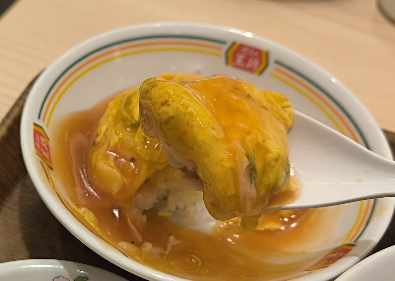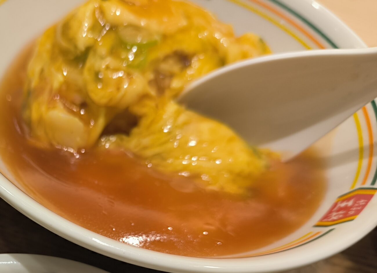 ふわふわ卵に絡む餡は、ほんのり甘めの味付けで、コクがあり、ラーメンとの相性もバッチリ。