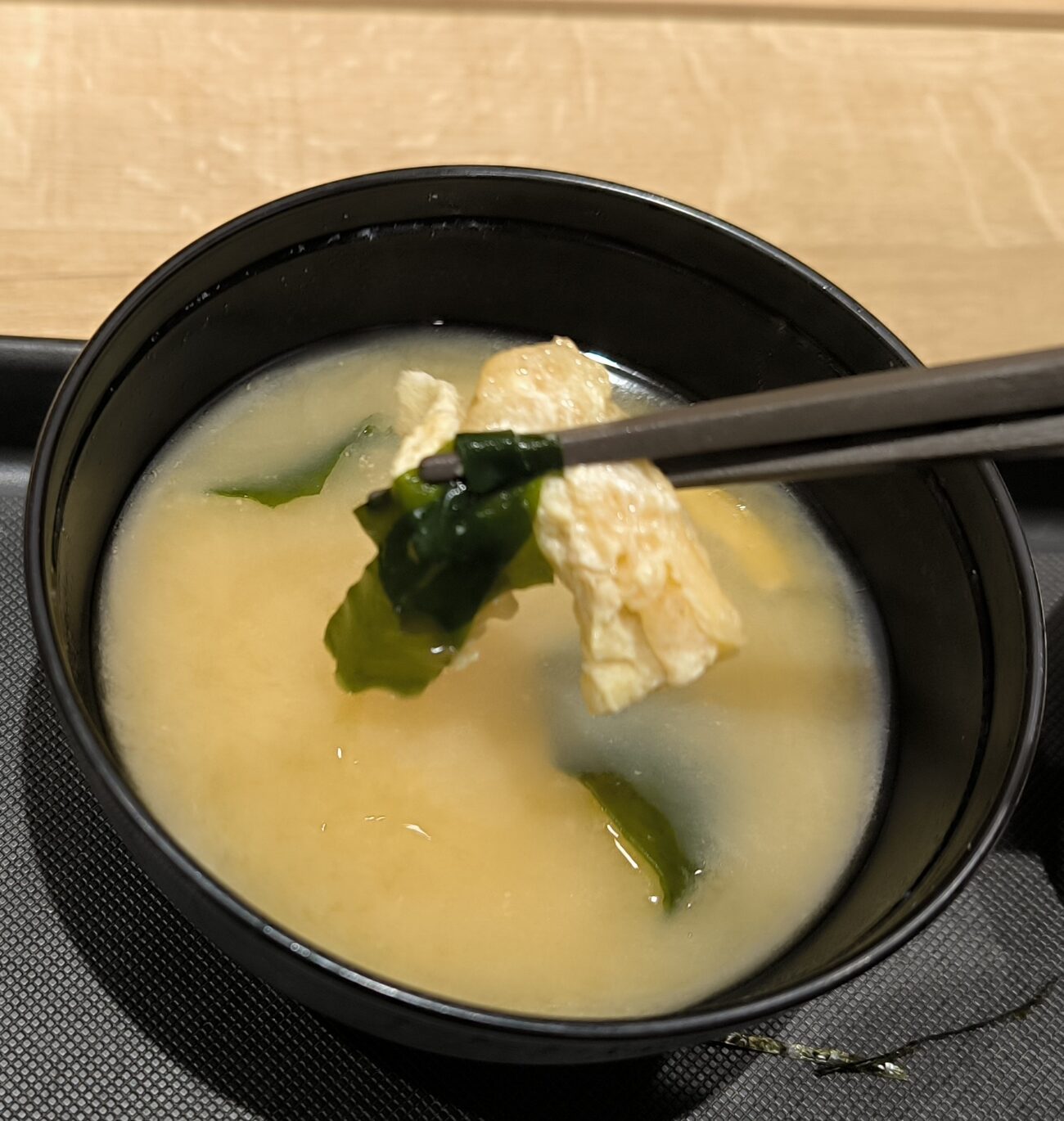 味噌汁はワカメ入りで、こちらはいつもの松屋らしい安定した内容です。