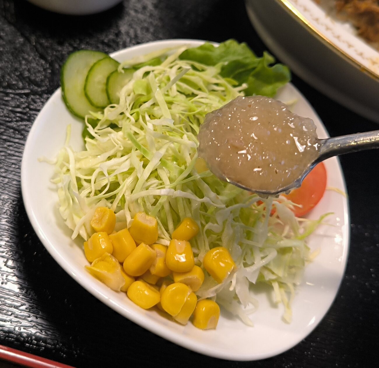 サラダには玉ねぎドレッシングがたっぷりかかっていて、野菜をしっかり食べている感覚になります。