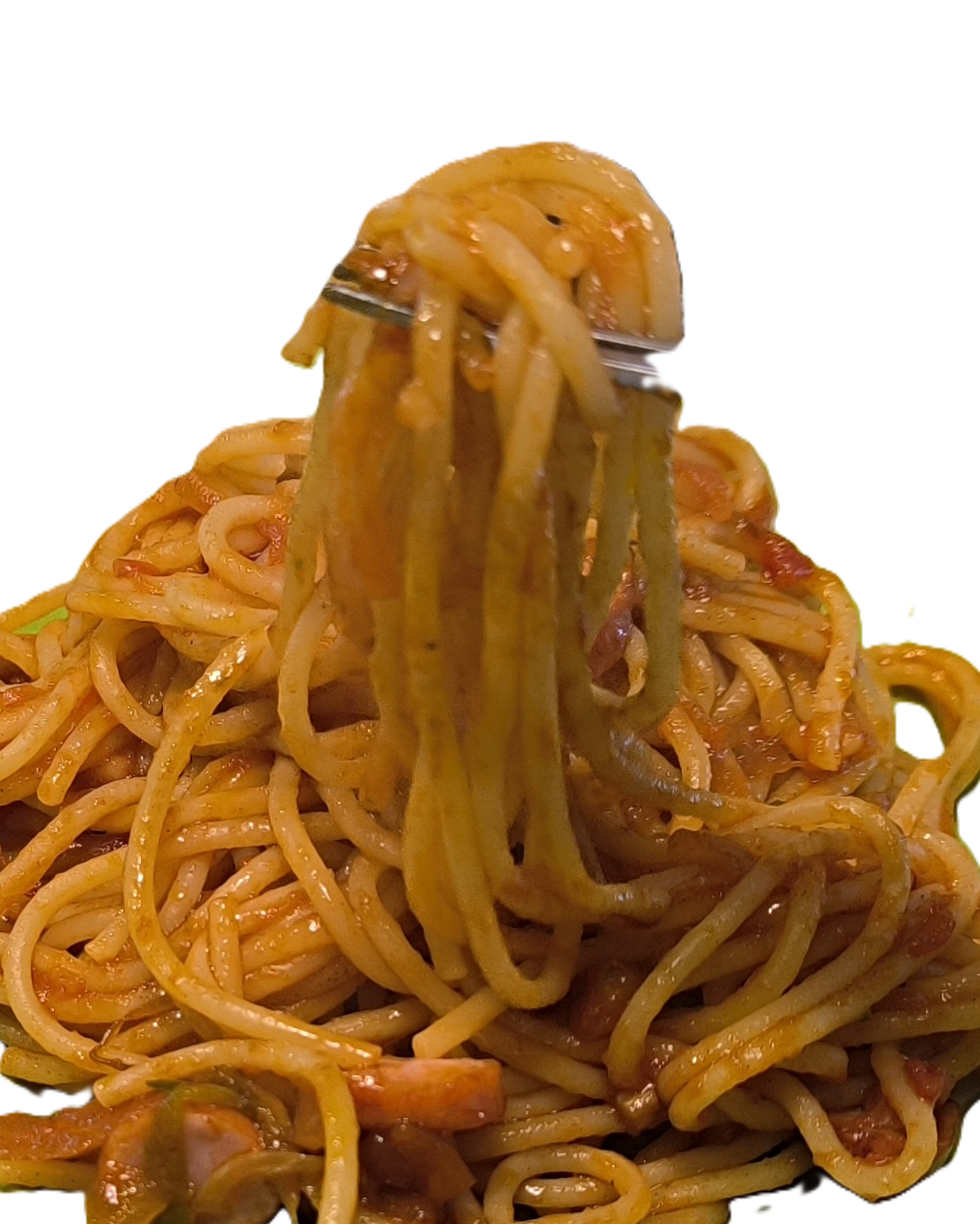 ナポリタンは熱々の状態で提供され、たまねぎとウインナーが入っています。