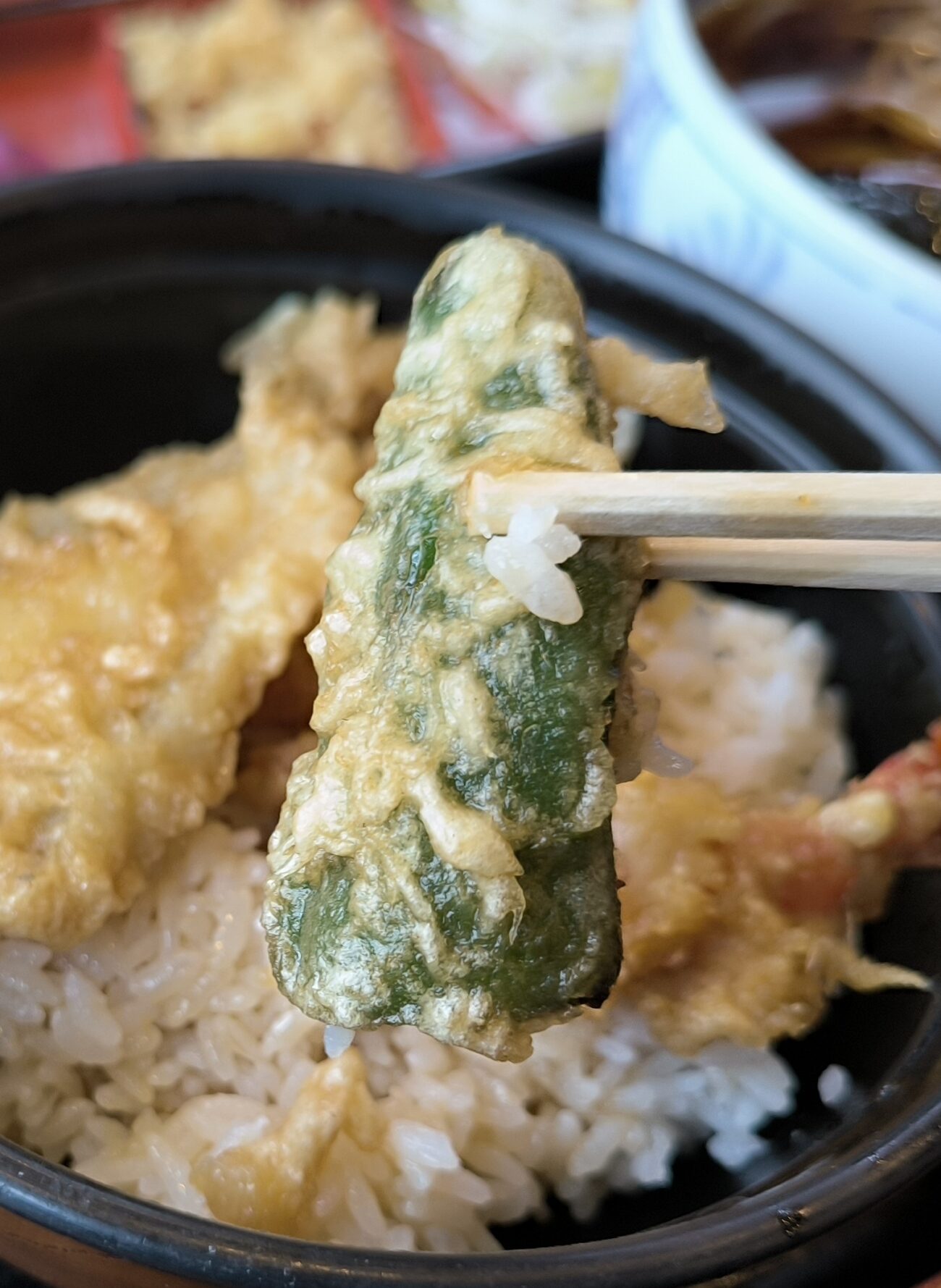 ししとうの天ぷらは軽く火が通っていて、噛むと野菜の旨みが出ます。