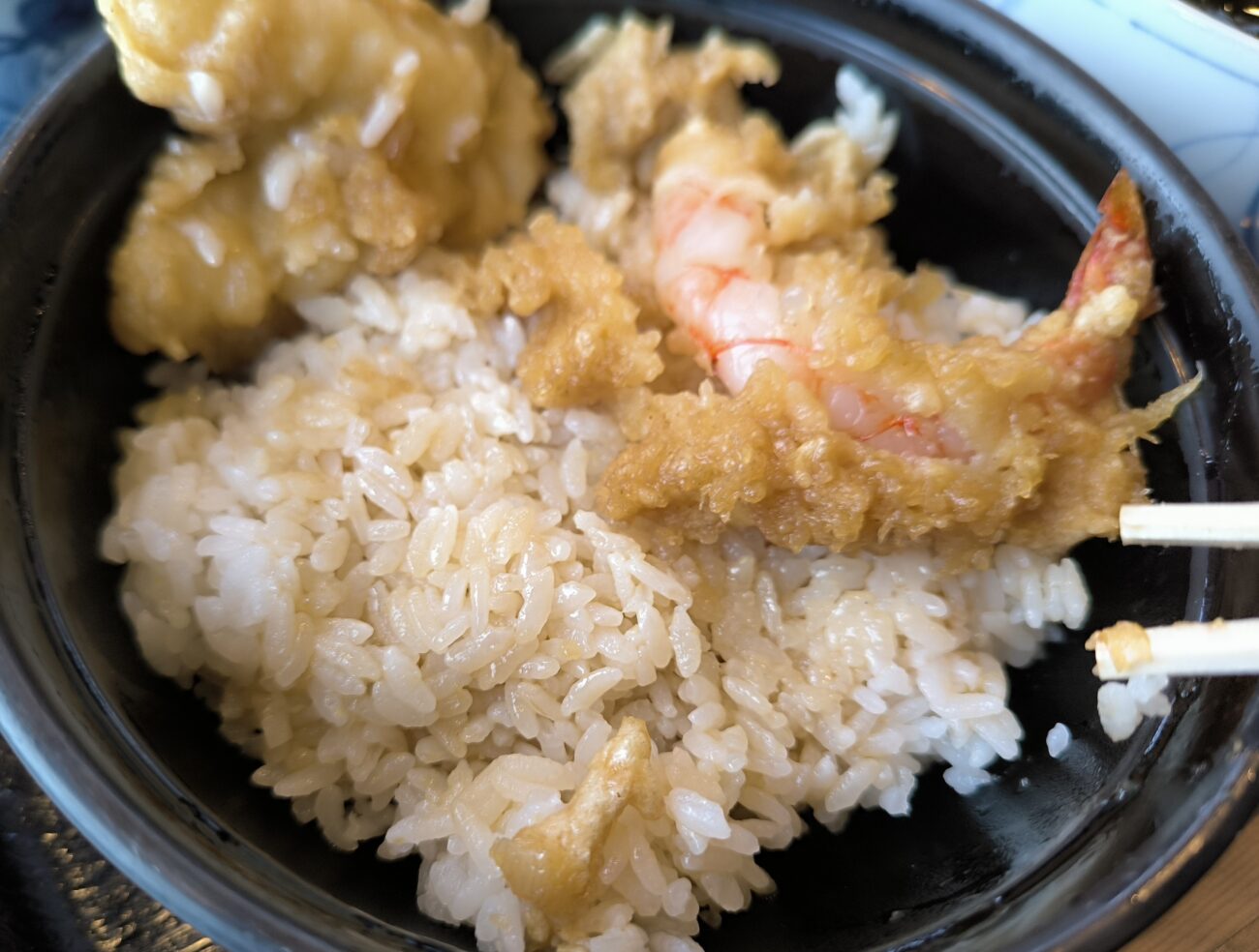 そして白身のキスの天ぷらは、ふわっとした食感と淡泊な魚の甘みが丼ご飯とよく合うんです。