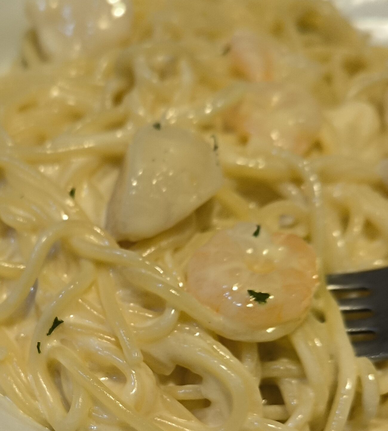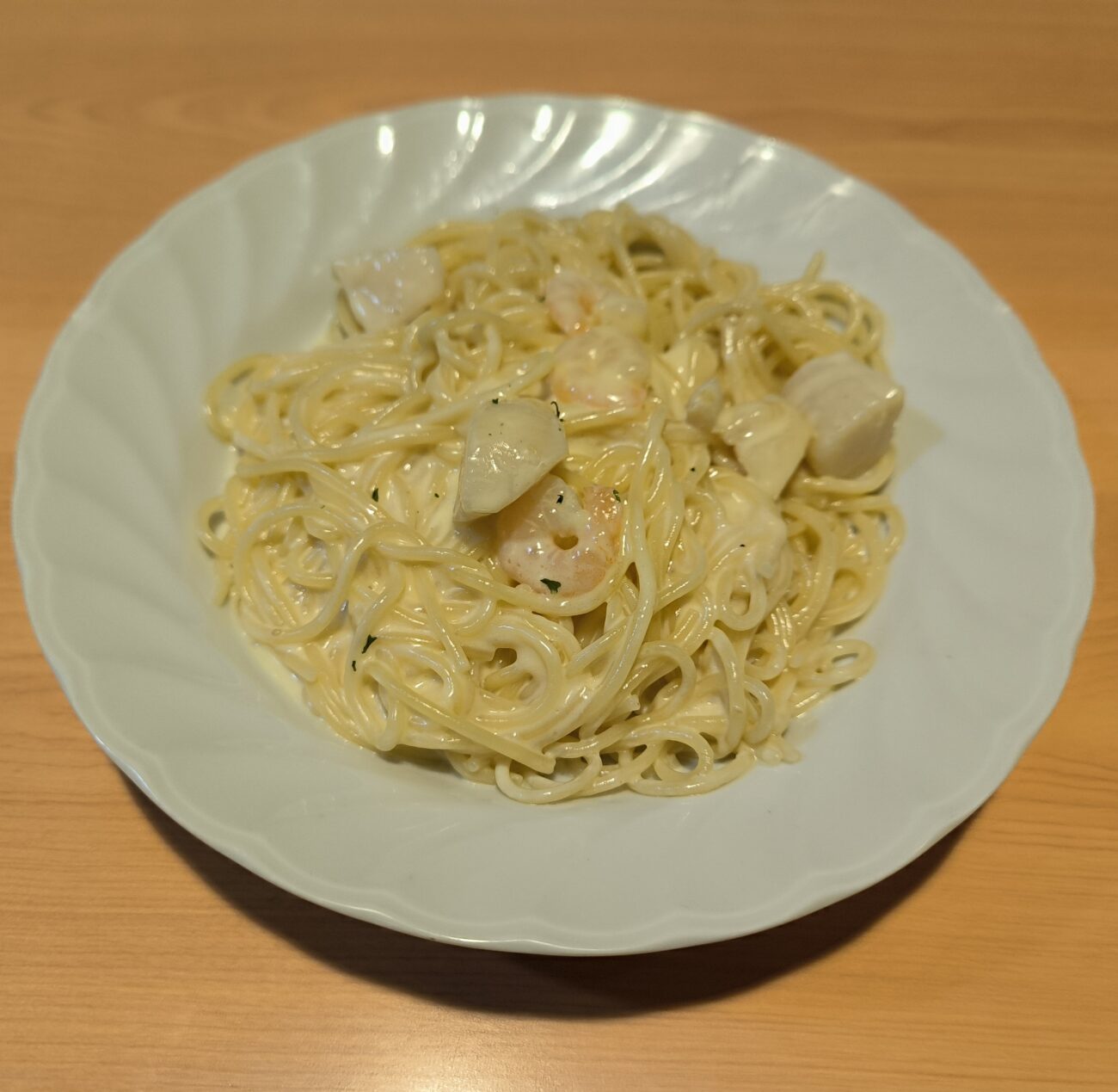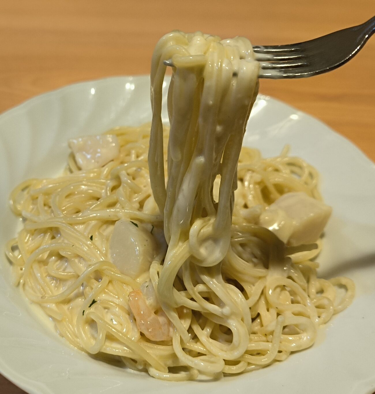 海の幸コンビがたっぷり乗ったパスタは、クリーミーなソースが麺に絡んでいて濃厚で滑らか。