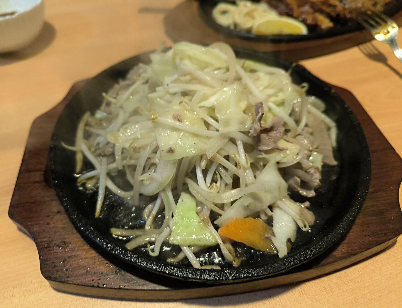 羊肉おも思ったより入っていて野菜が鉄板でジュッと提供されるスタイルで、、香ばしい香りが食欲をそそります。タレはあっさり懐かしい味わい。