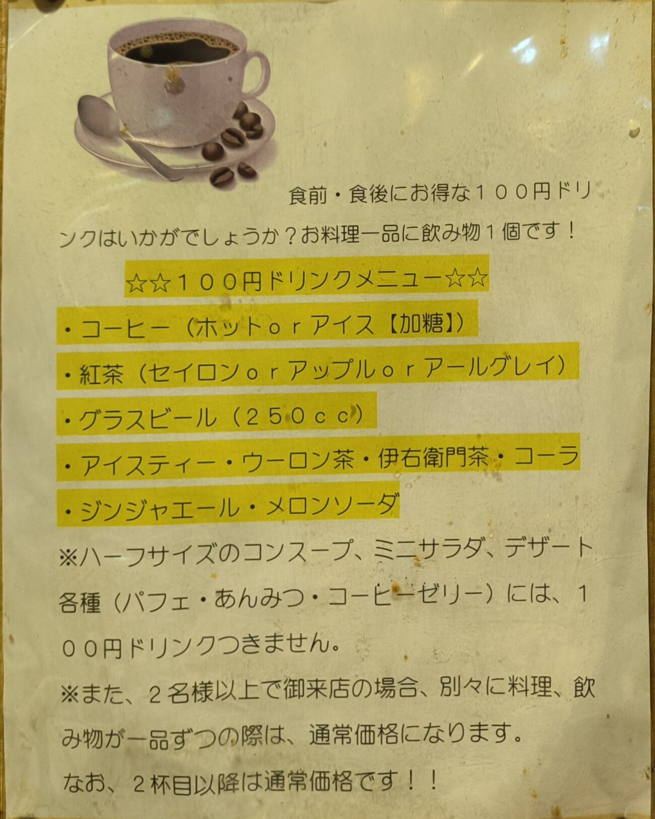 プラス100円でコーヒーか紅茶 だそうで、「あーよくあるヤツね。」と軽く流したところ、向かいから「これってピールもと書いてないー?」というのです。