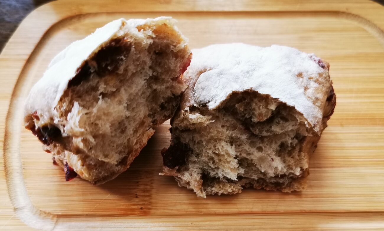 ドライフルーツがけっこう入っているブランパンで、食感はソフトです。