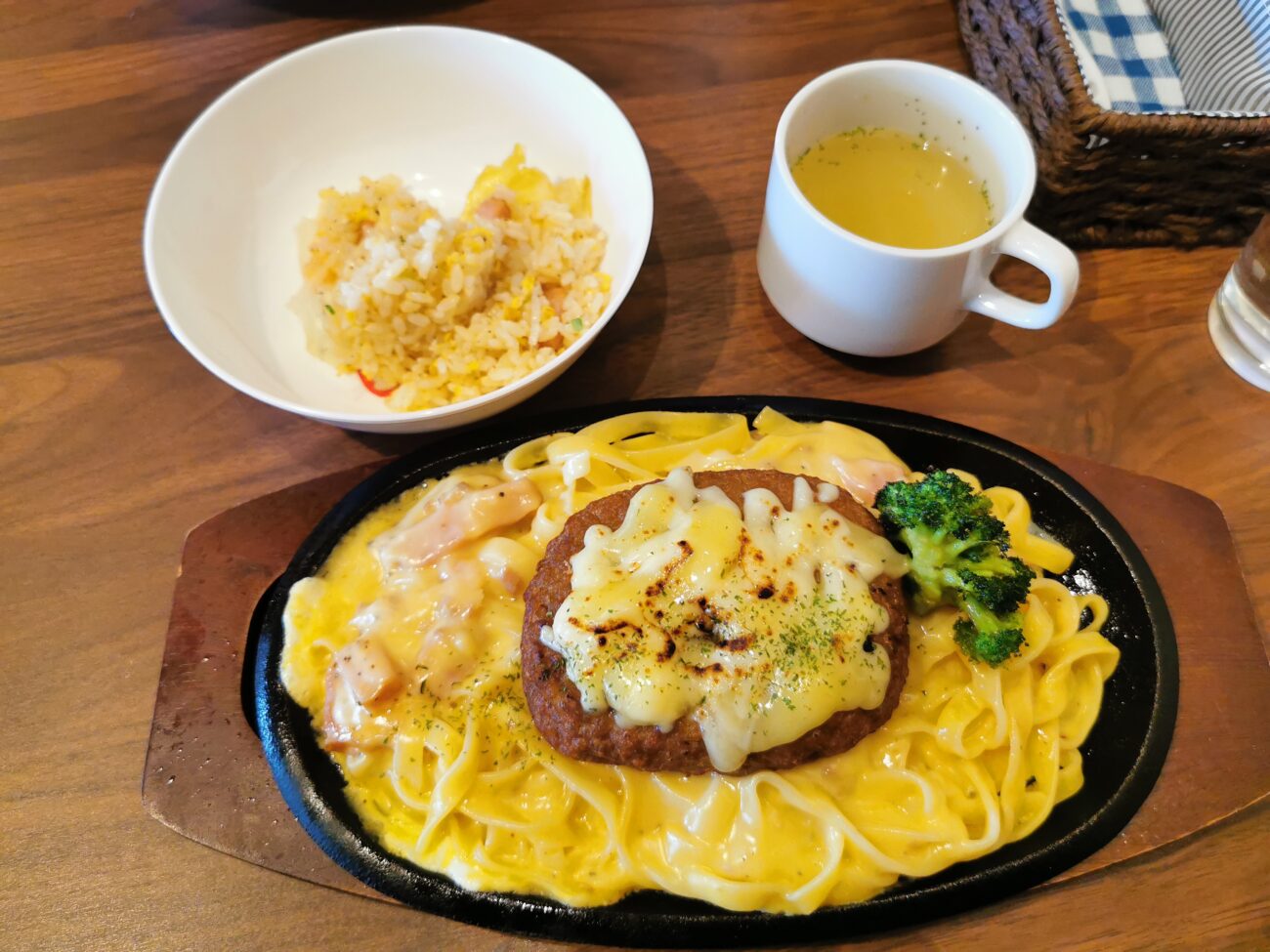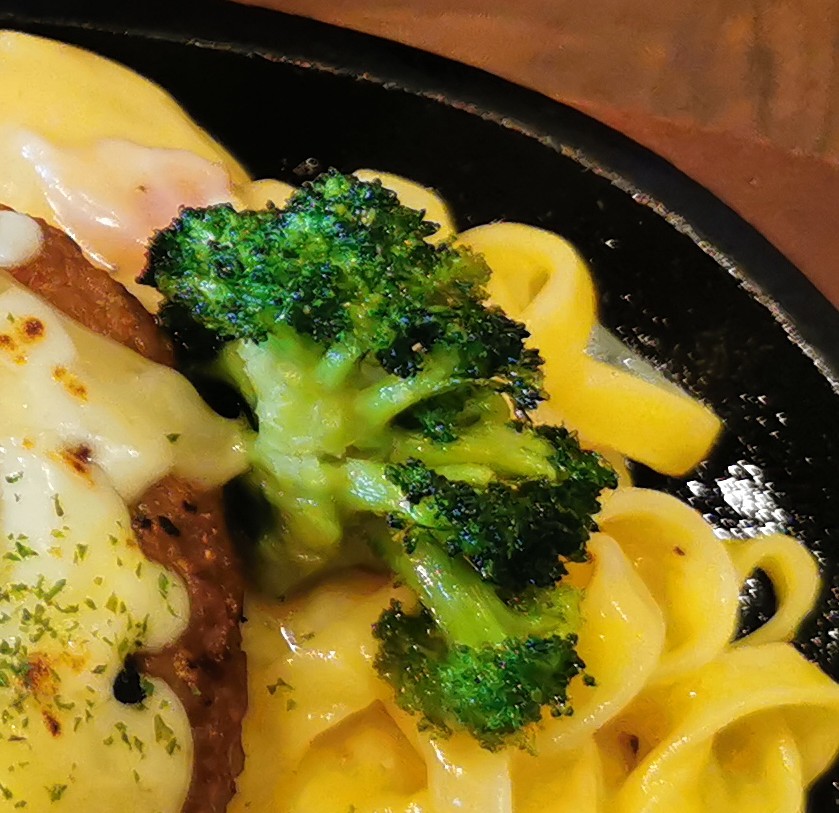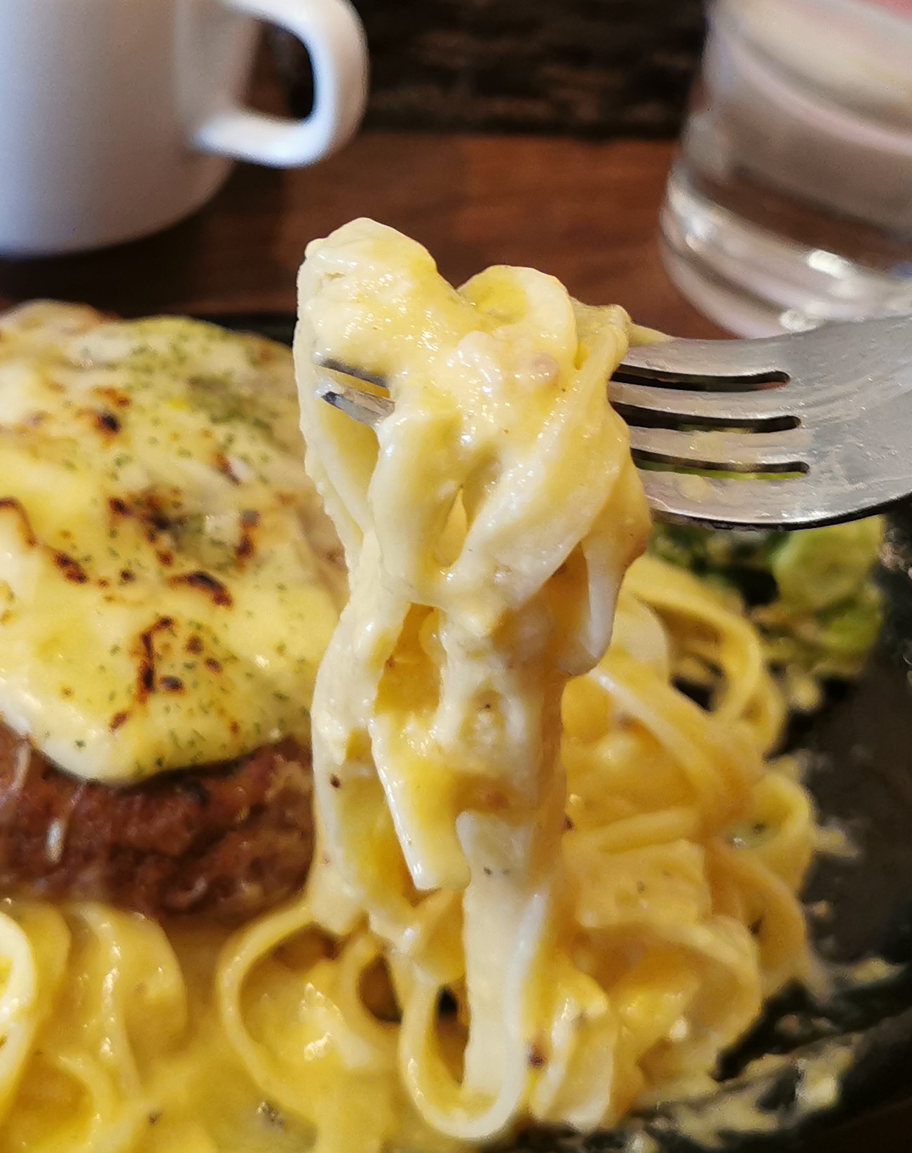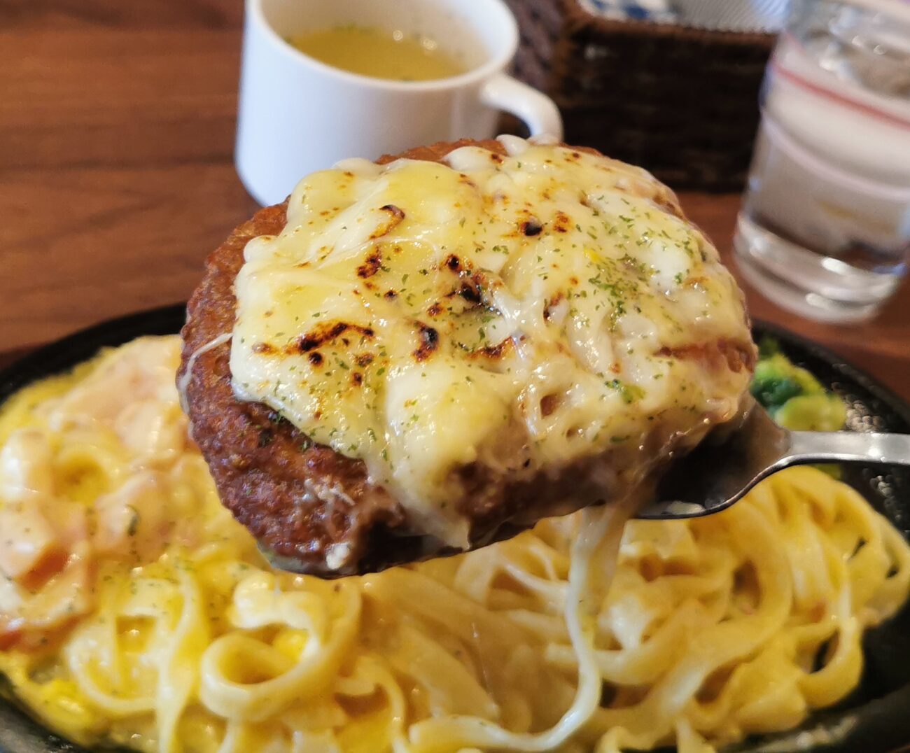 これはカルボナーラにチーズがたっぷり 乗ったハンバーグが上にある料理です。