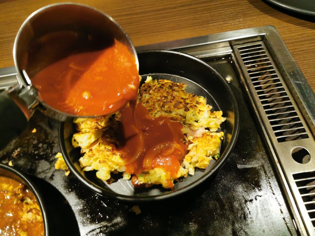 鉄板に落とした瞬間、ジュワッという音。これだけで気分は勝ちです。