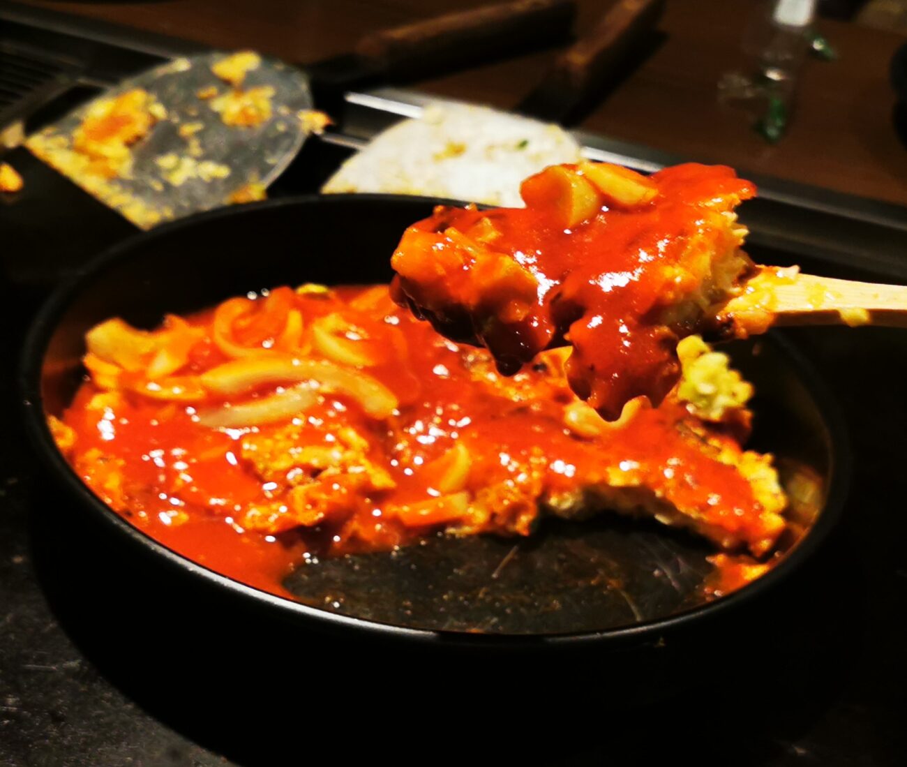 混ぜる→焼く→ひっくり返す→煮込む→完成!という流れで、焦げ目が付きつつも不安定な美しさ(笑)の一皿に。