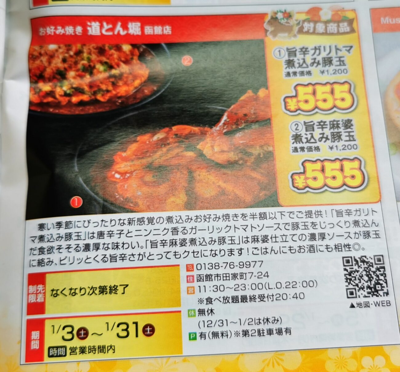 新年恒例のダテパーのクーポン、今年もやってきました。ページをめくりながら「どれが一番お得かな〜?」と探した結果、真っ先に目についたのがここの【道とん堀函館店】。