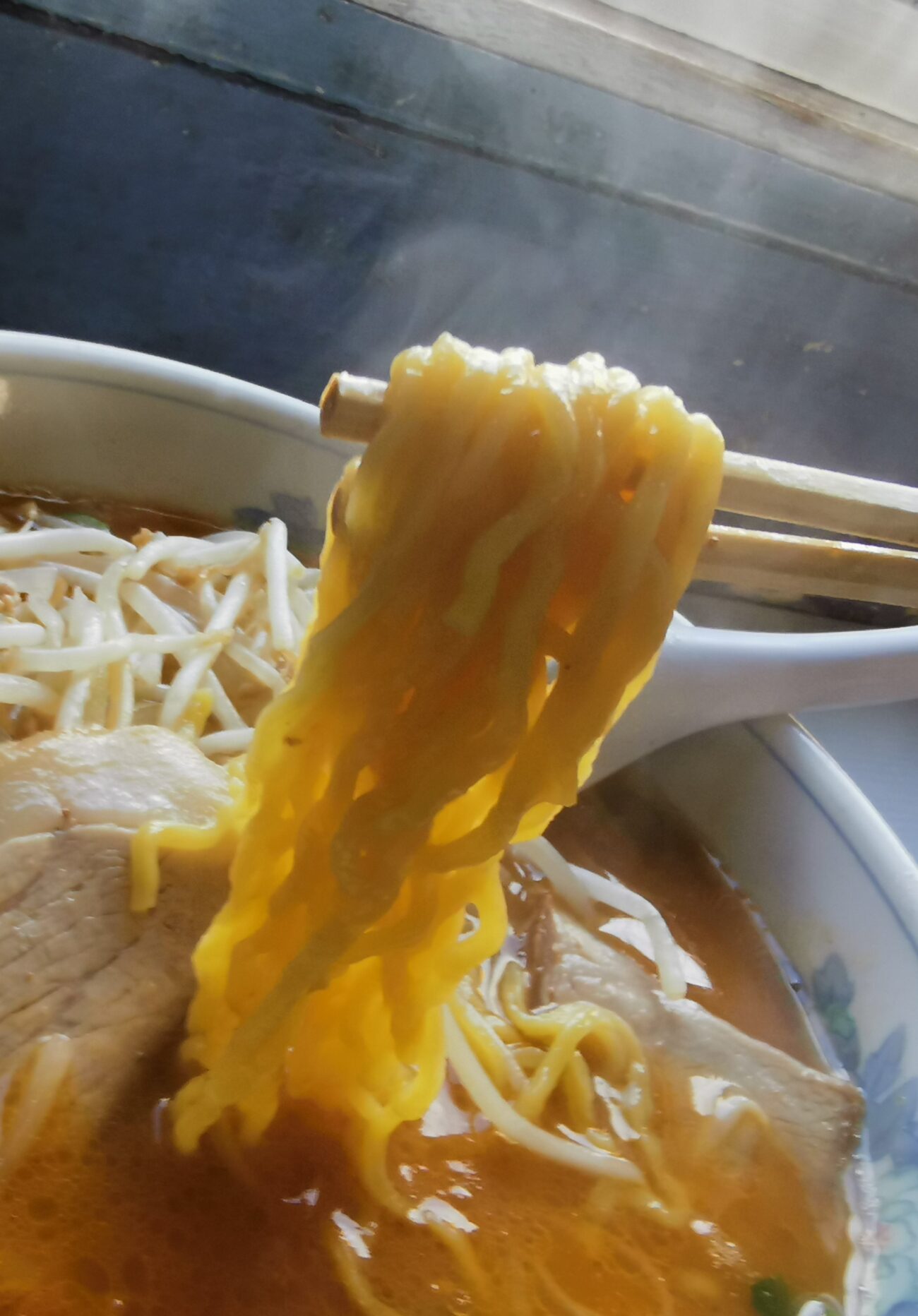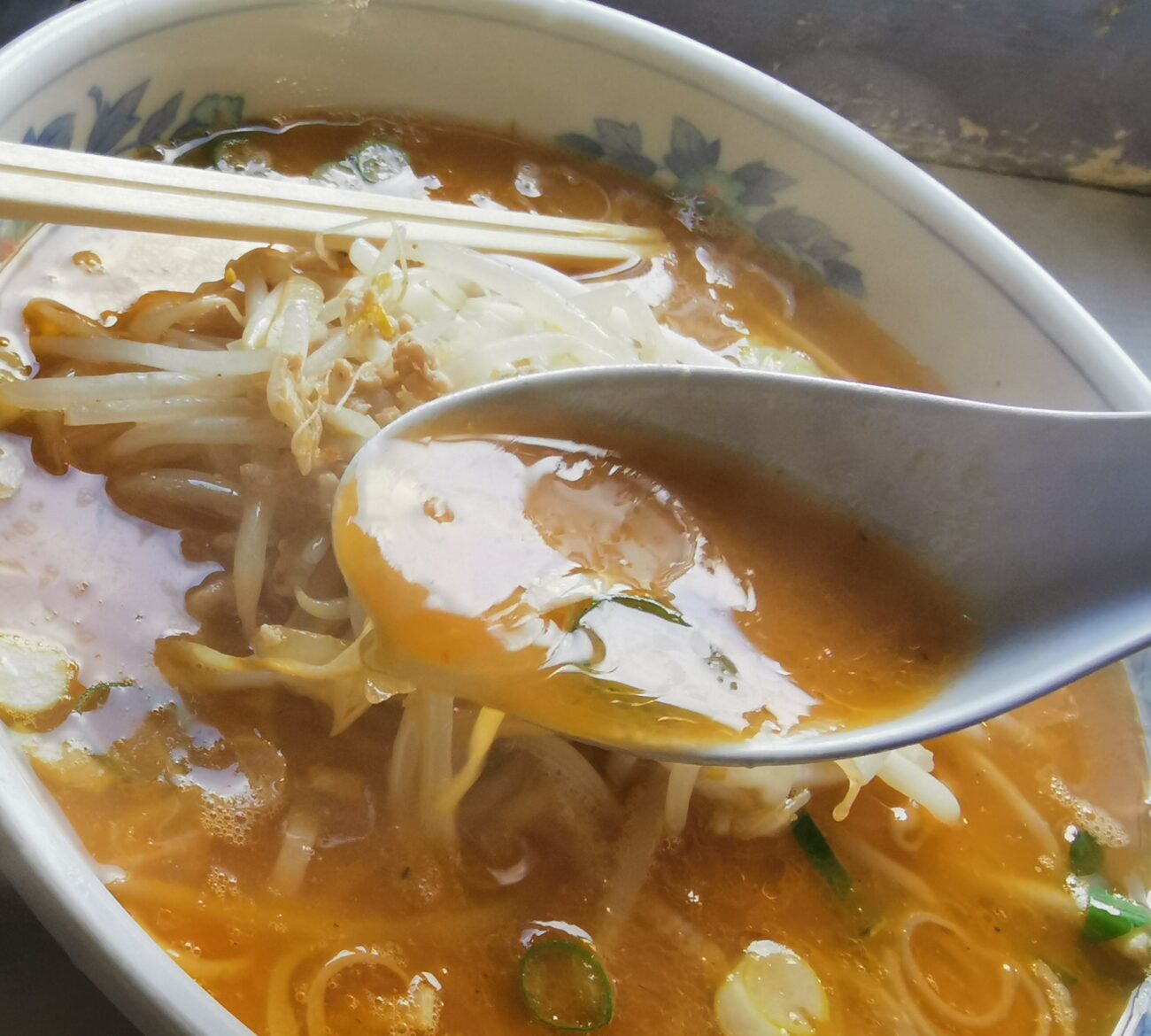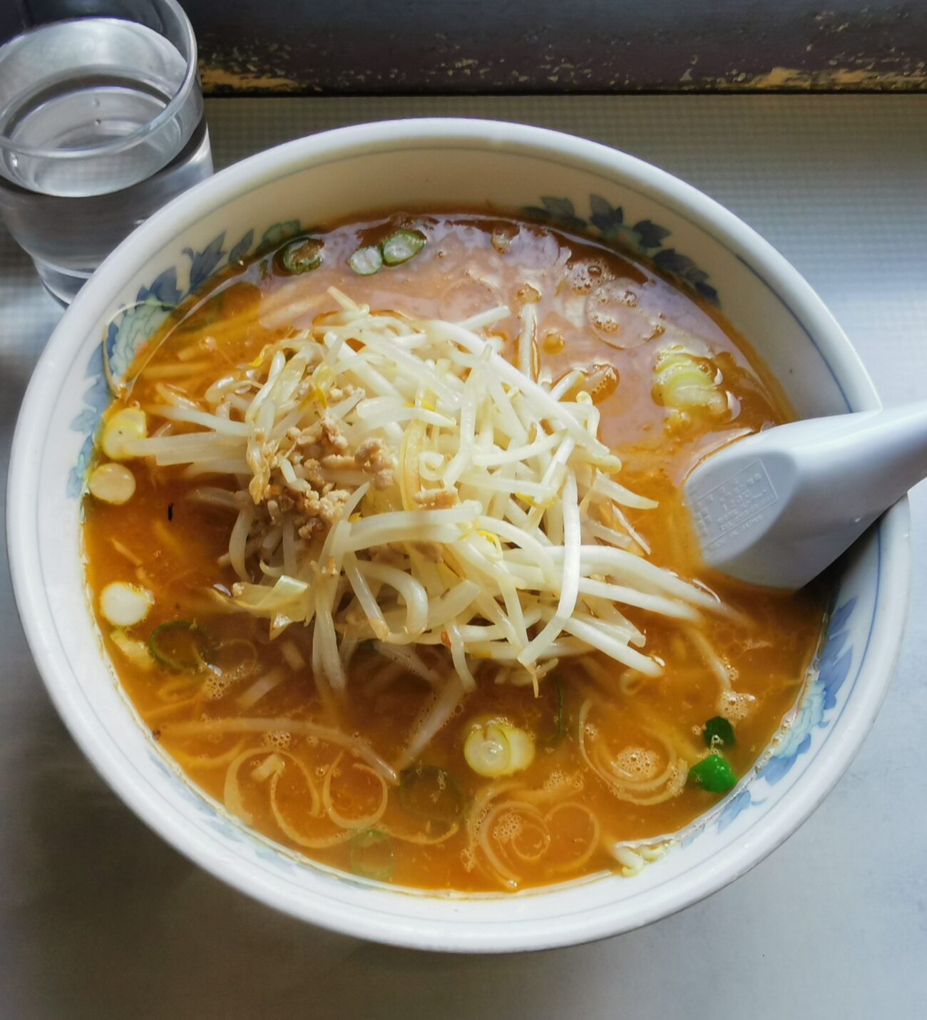 どんぶりには味噌スープがなみなみと注がれ、その上にはモヤシが山のように盛られています。