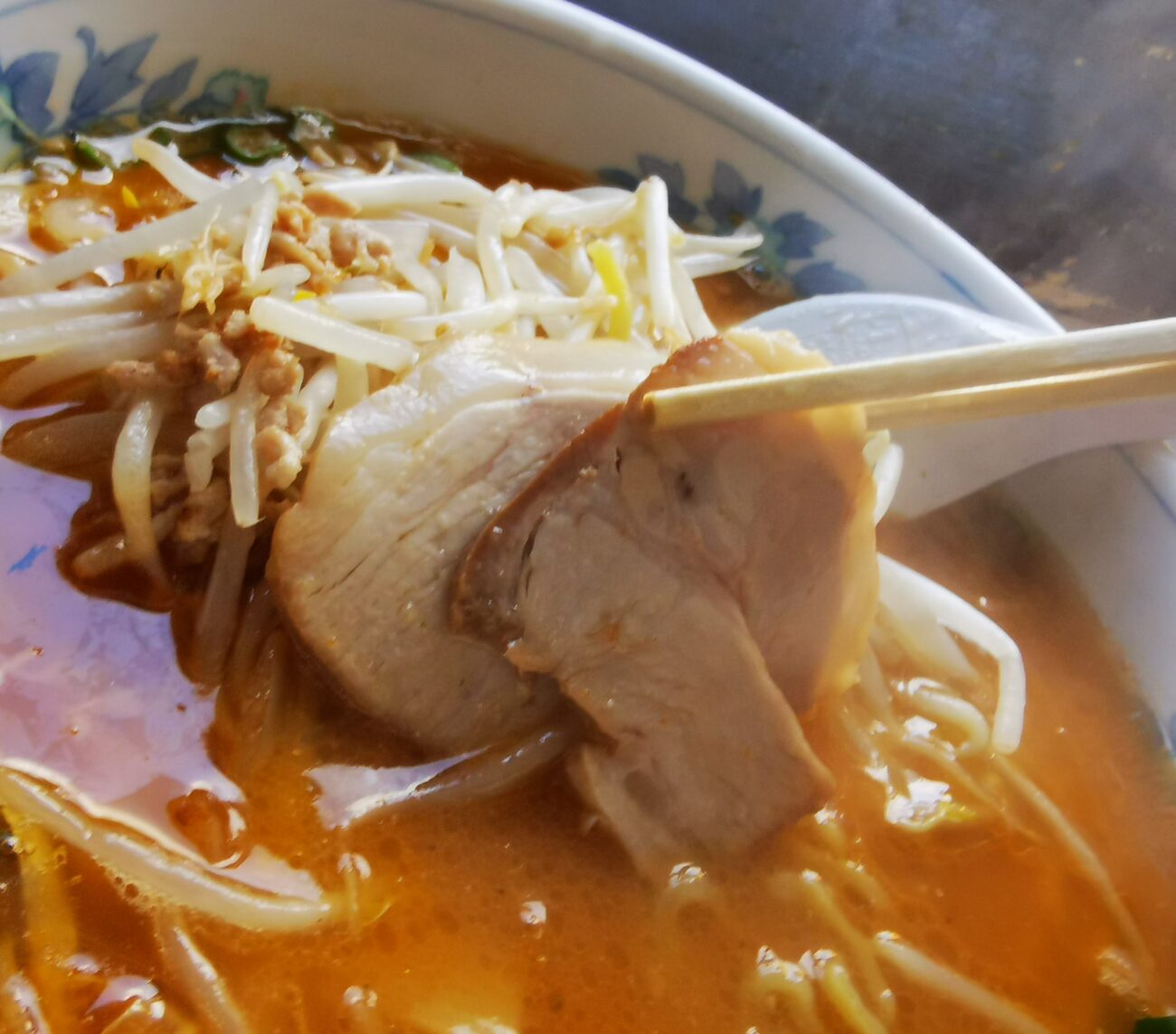 トッピングのモヤシの下にはチャーシューが隠れていて、さらに挽肉まで混ざっているんです。