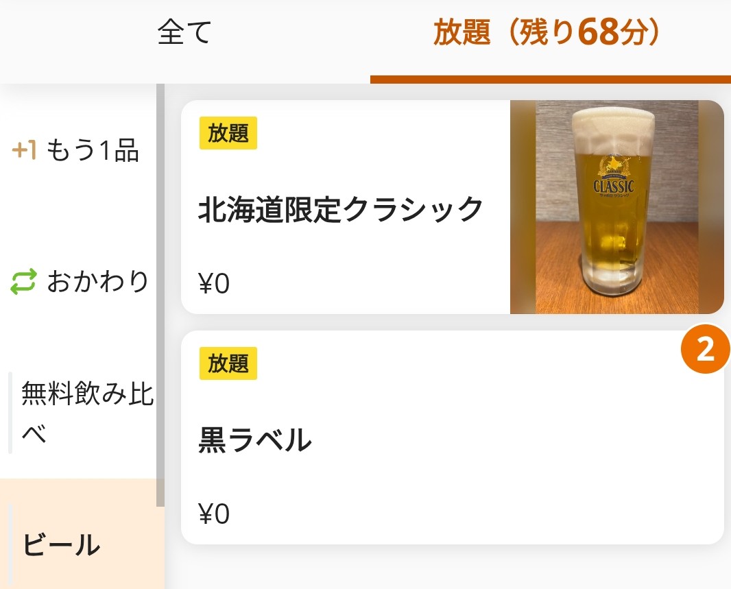 ビール好きにはたまらないサッポロクラシックと黒ラベルの飲み放題。