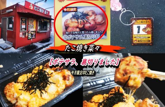 今月限定のたこ焼きは「ポテサラ、裏切りました」です。