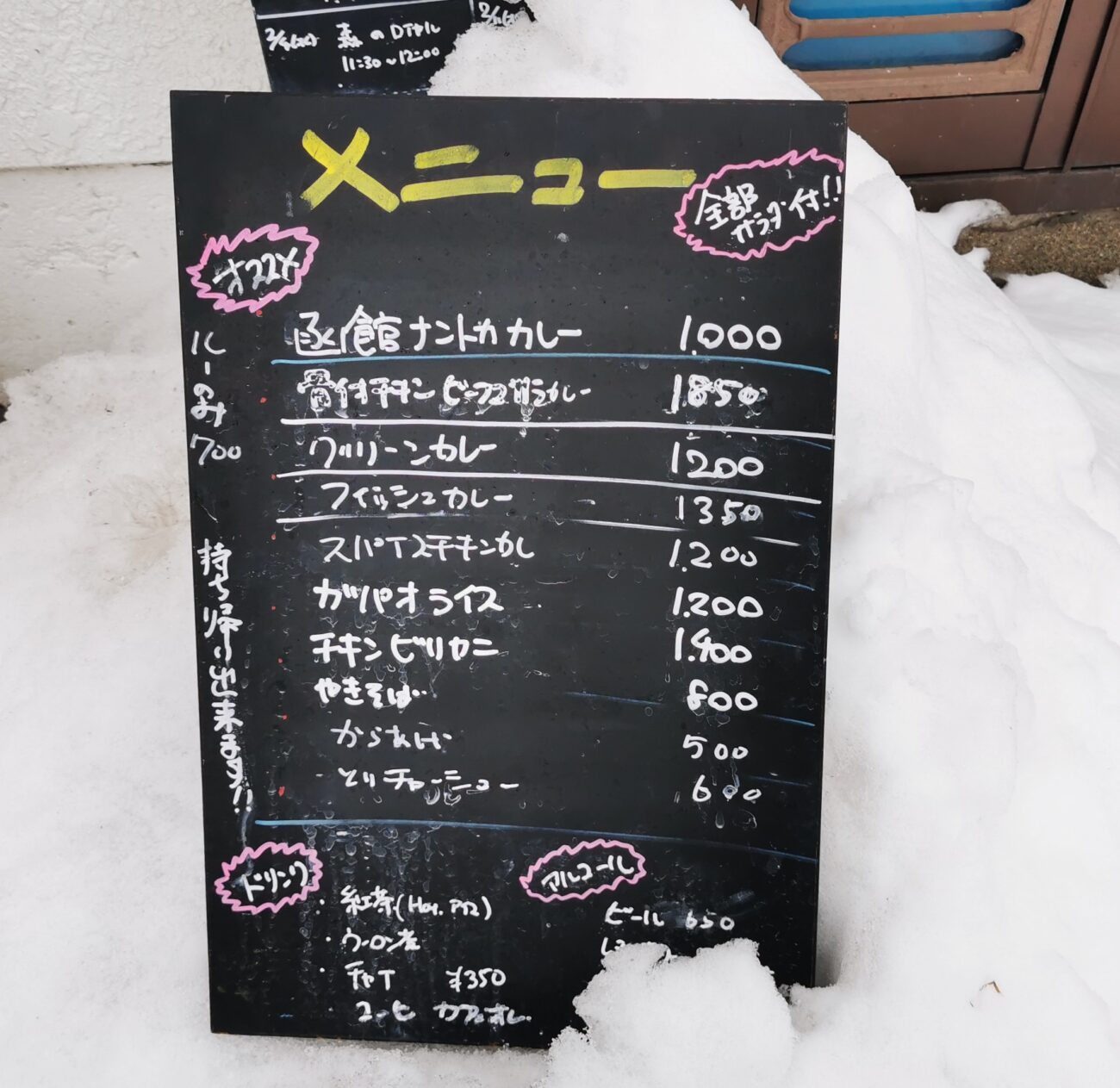 メニューを雪に挿しているというのは、まさしく今の季節を感じさせます。
