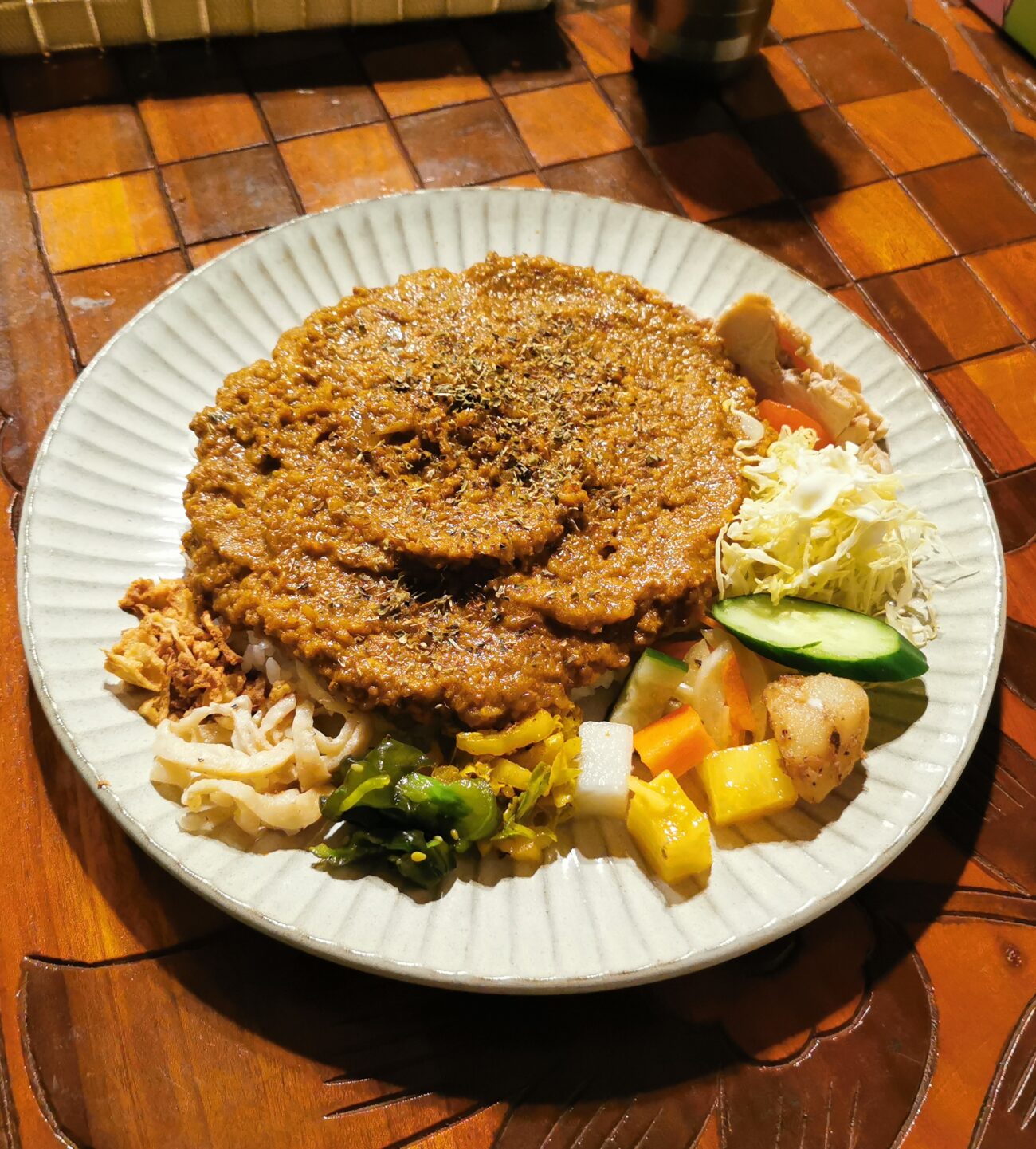 プレートの周りには、鶏肉やサラダ、高野豆腐など数種類の付け合わせが添えられていて、見た目はなかなか賑やかです。
