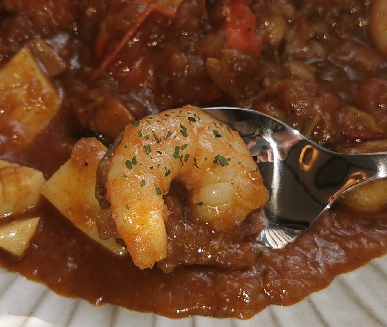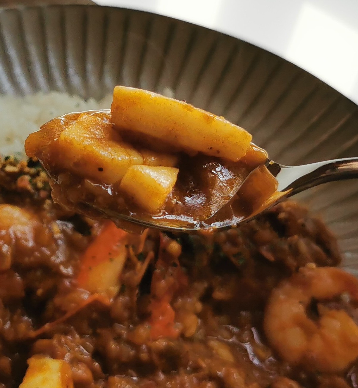 カレーはスパイスをふんだんに使ったスパイシー系なのかなと思いましたが、そこまで強いスパイス感はありませんでした。