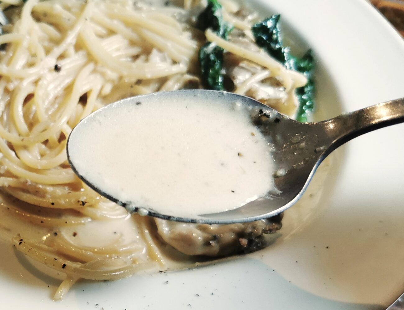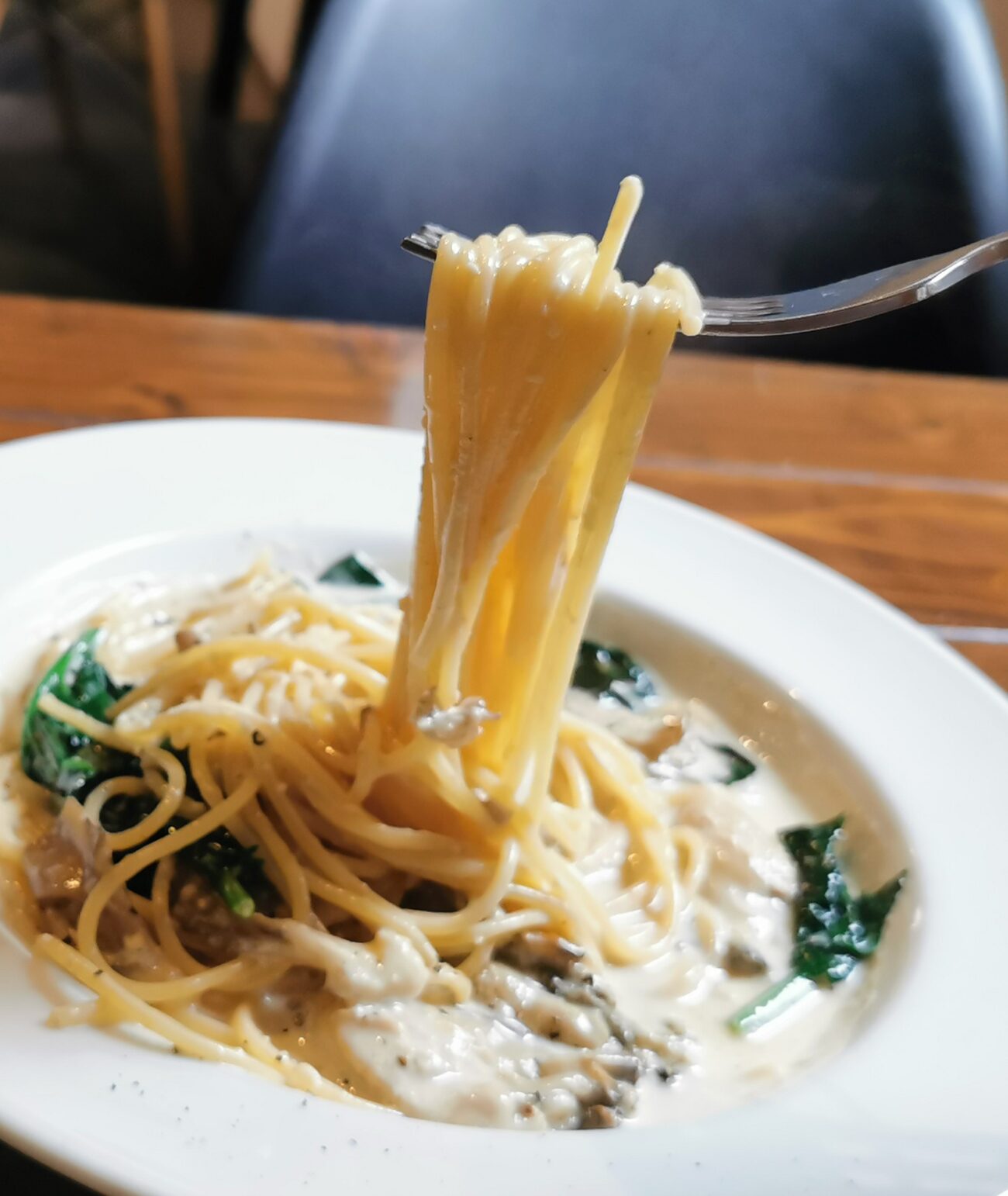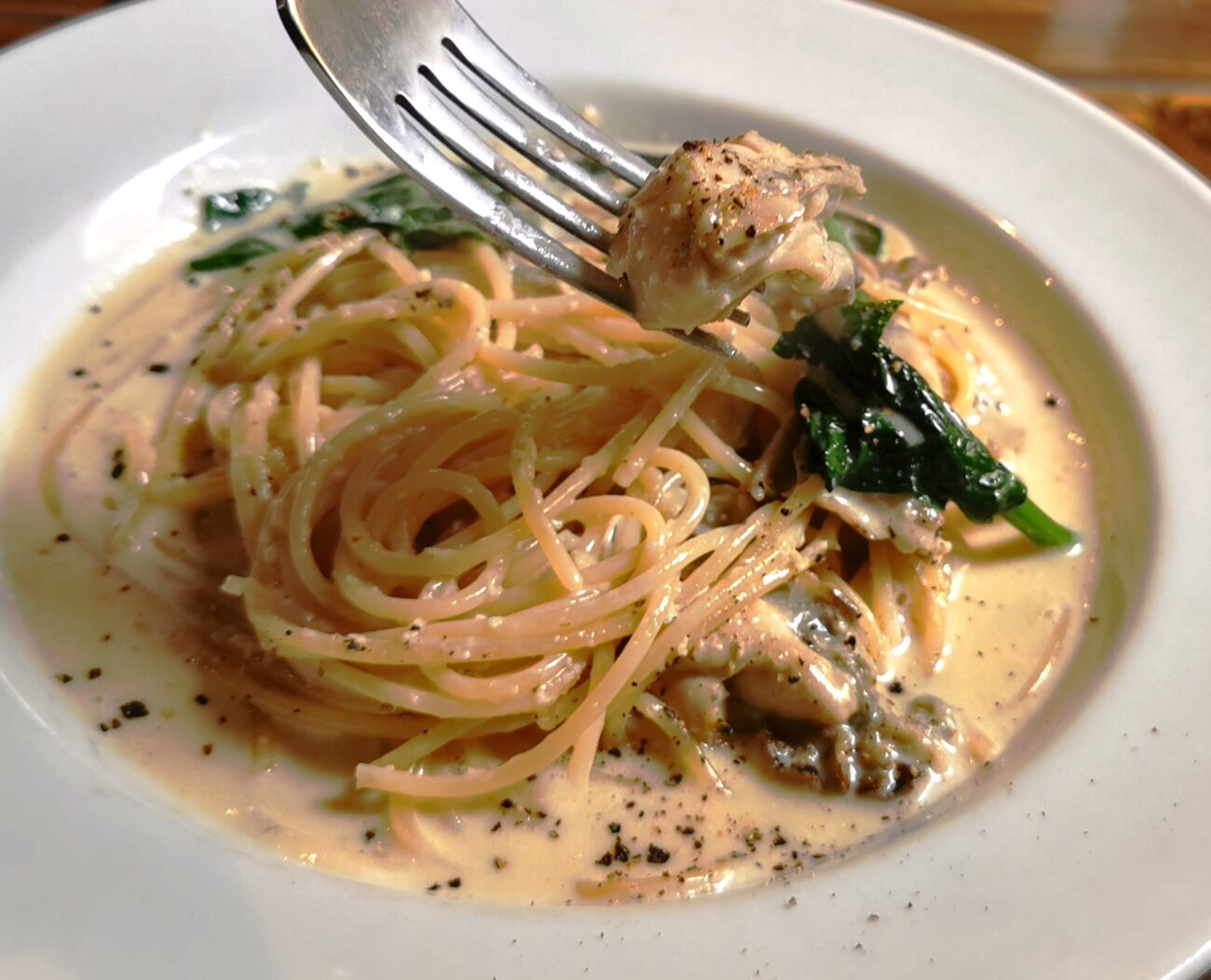 麺がクリームソースをしっかりまとって持ち上がります。