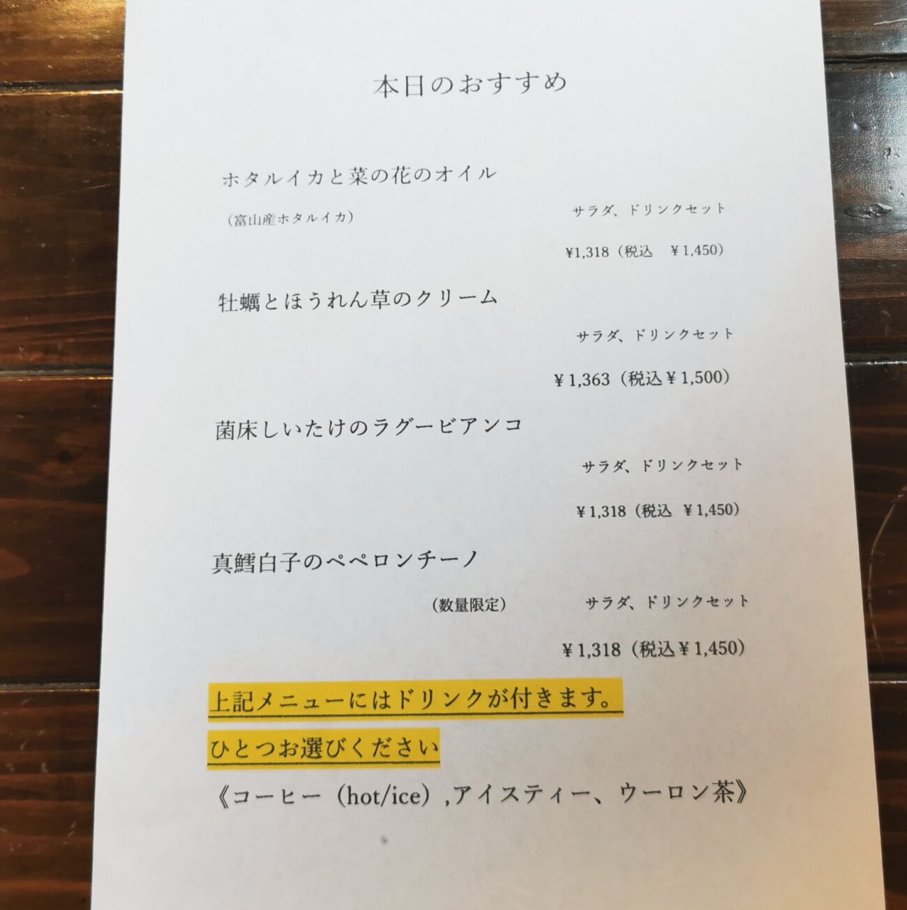 「本日のおすすめ」には、ドリンクが付くようになりました。