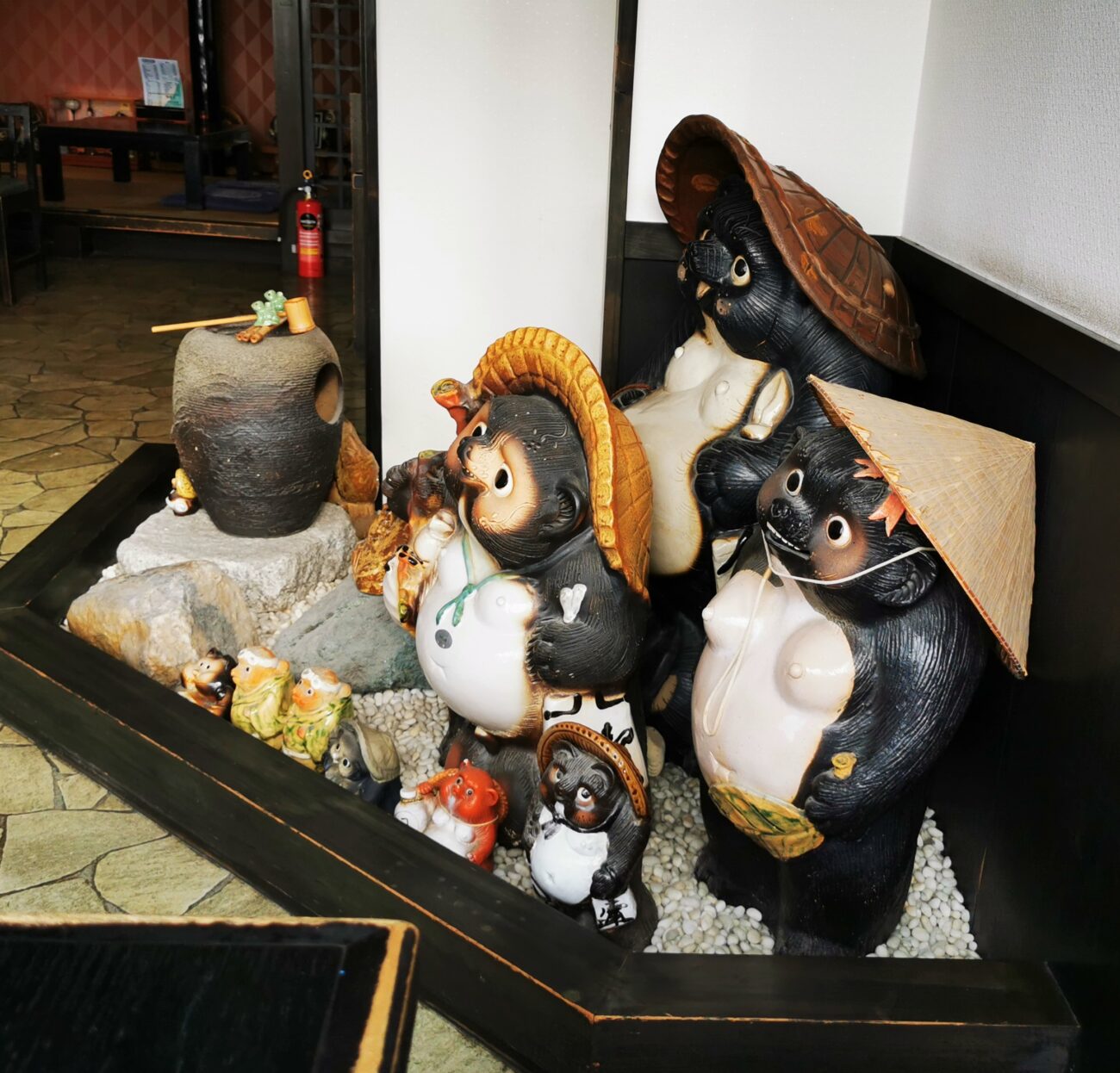 入り口付近や店内のあちこちにたぬきの置物や飾りがあって、ちょっとシュールで愛嬌あります。