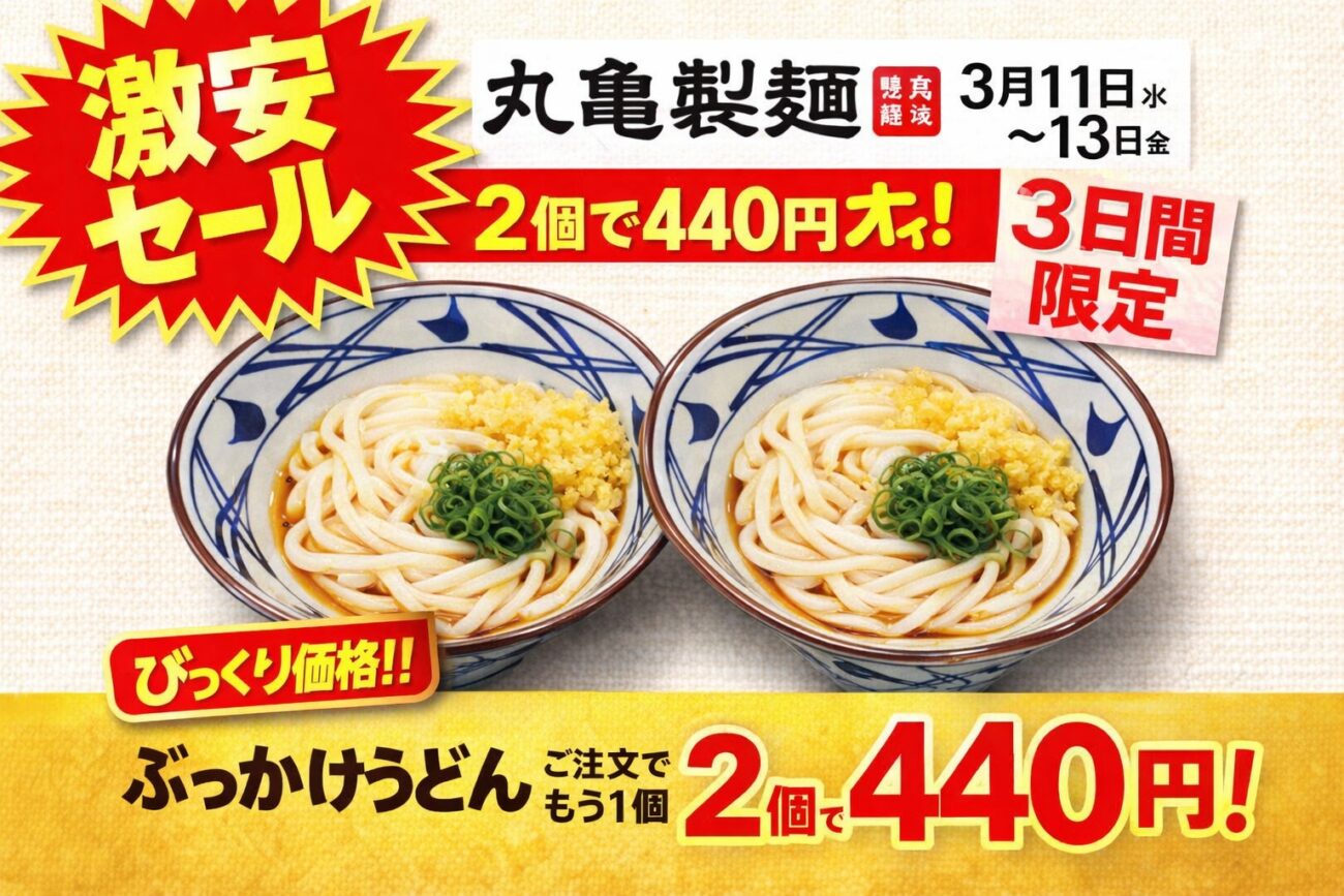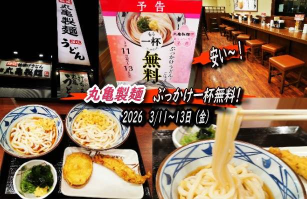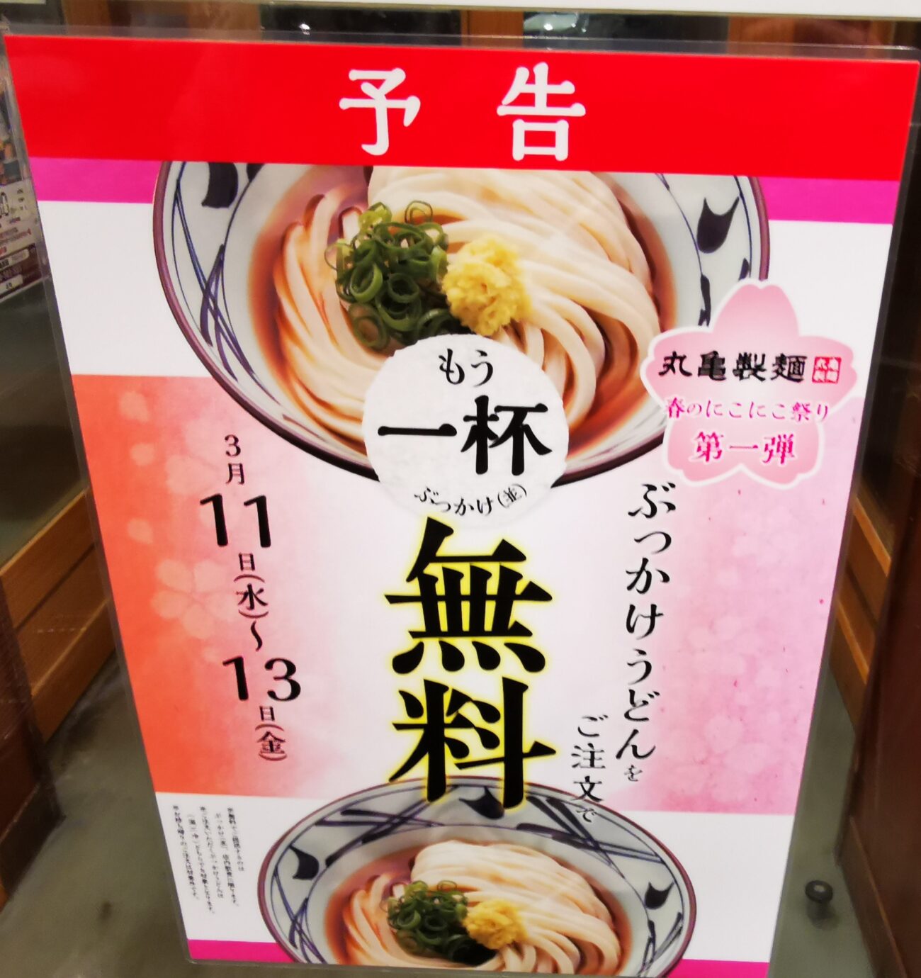 なんと 3月11日から13日までの期間限定で、ぶっかけうどんを注文すると、もう一杯ぶっかけうどんが無料というサービス。
