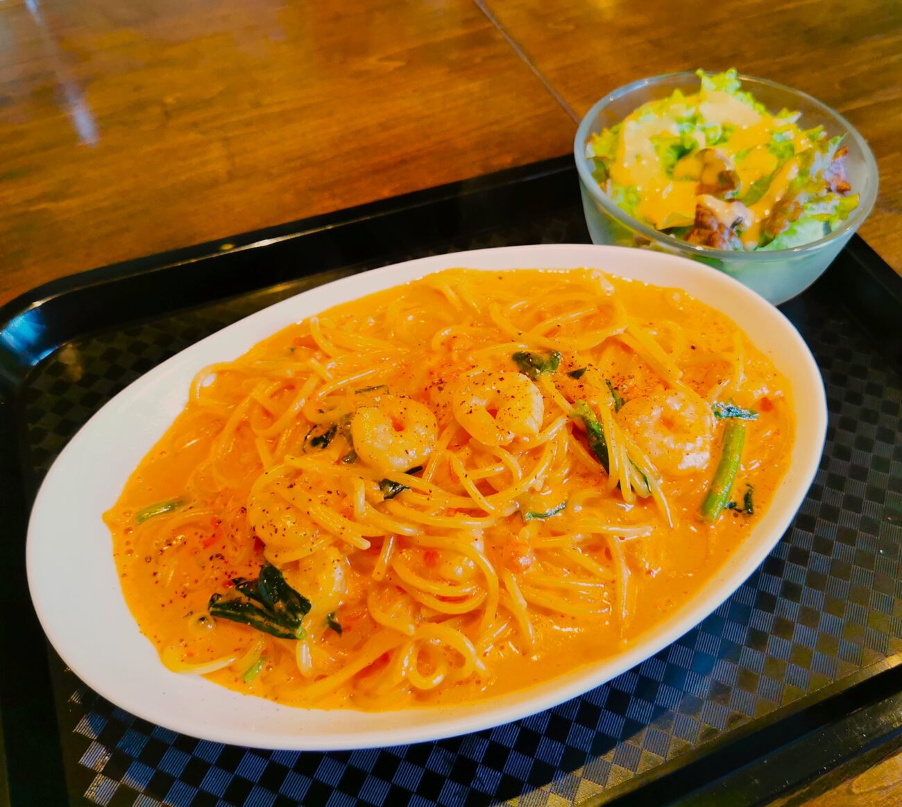 エビとホウレン草のトマトクリームパスタ