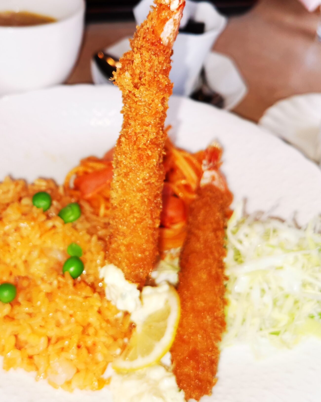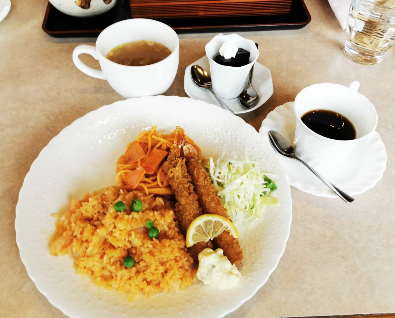 エビフライが2本に、ナポリタンとピラフがワンプレートに盛られた一皿。