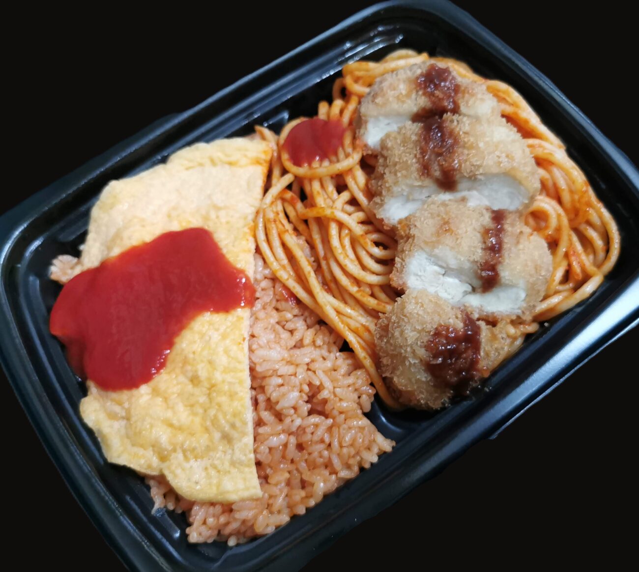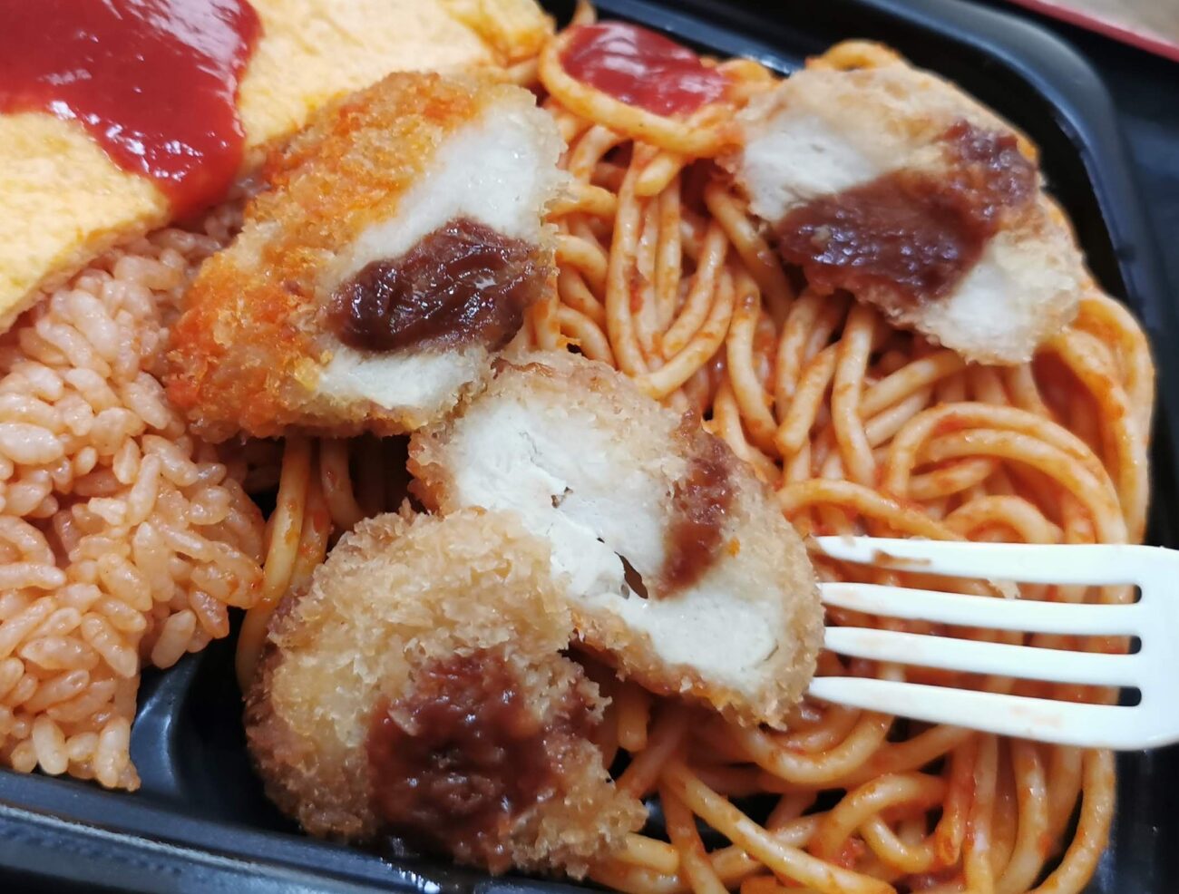 中を見てみると、ナポリタンの上にカツがドン。